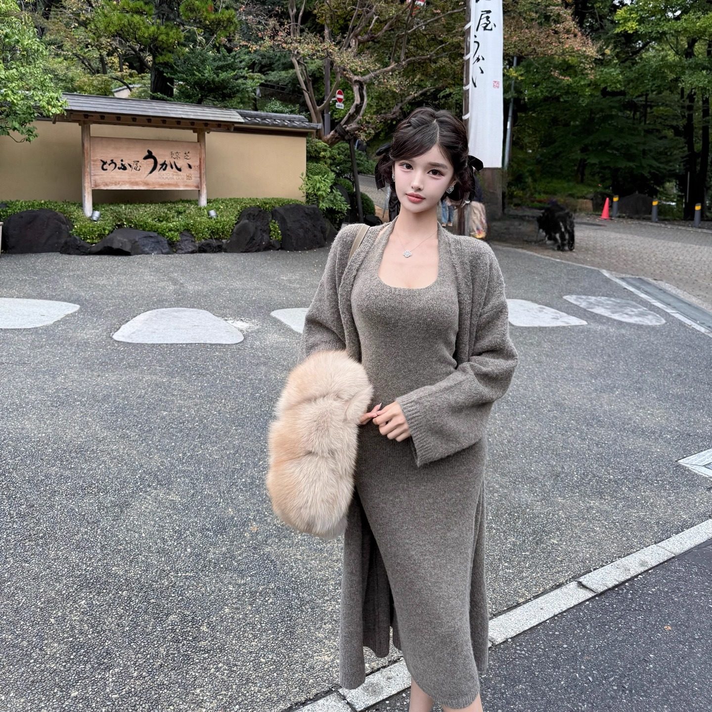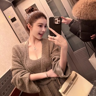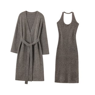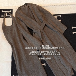 套装 灰色羊毛挂脖花纱针织吊带连衣裙秋V领开衫 摩卡棕 韩雨嘉