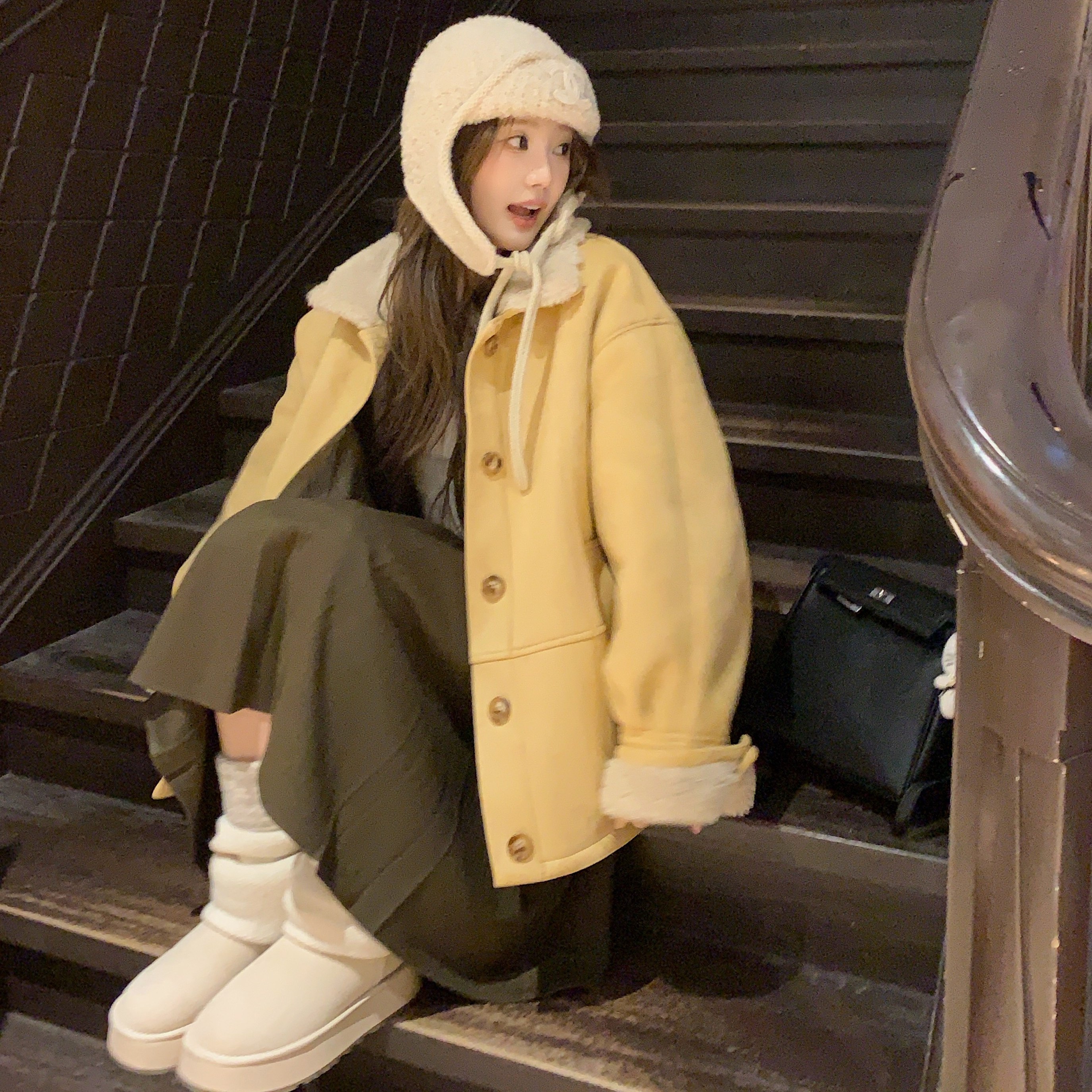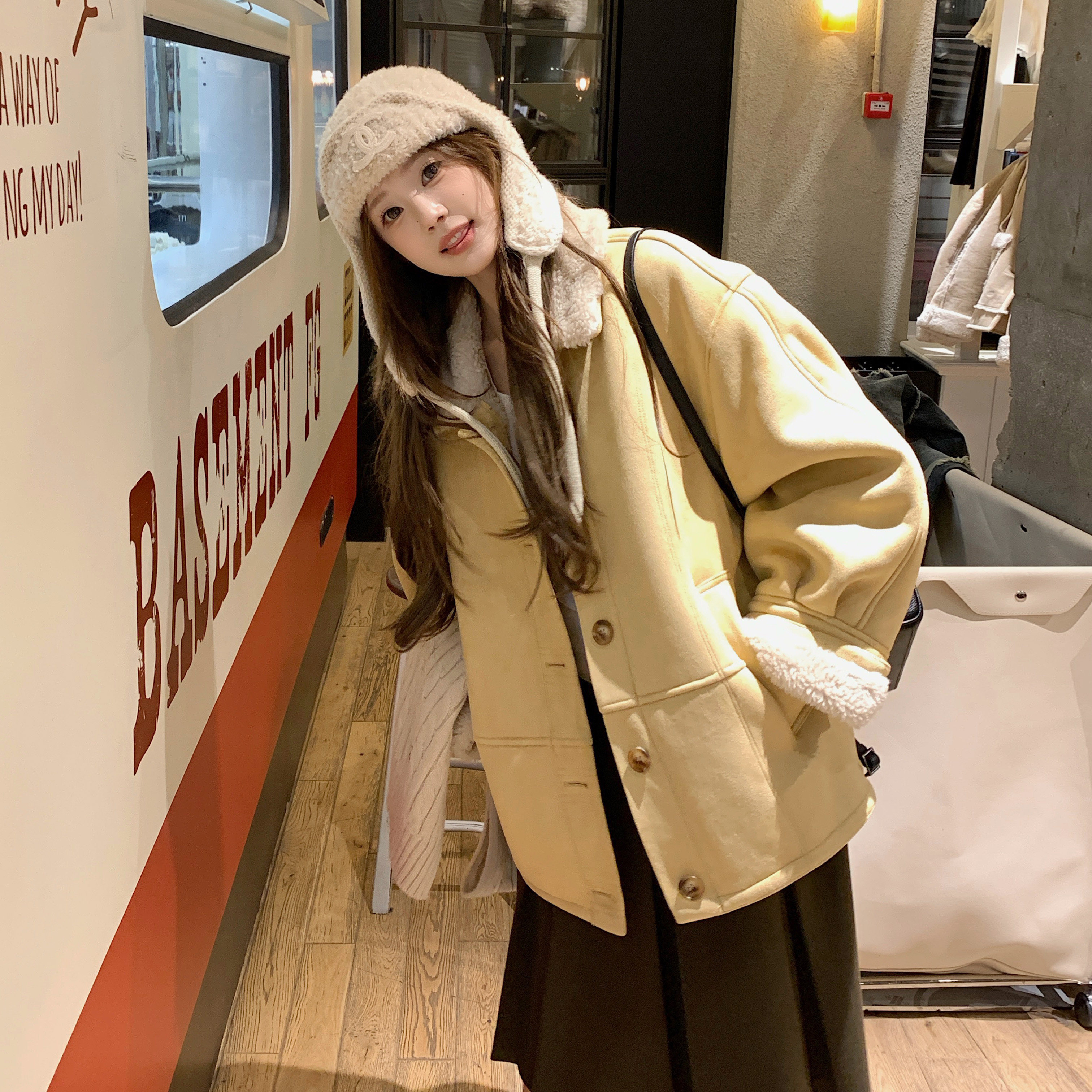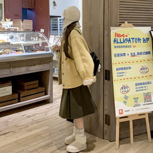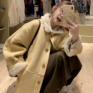 JAMUUS复古羊羔毛皮毛一体翻领外套麂皮绒保暖上衣 毛呢半身裙
