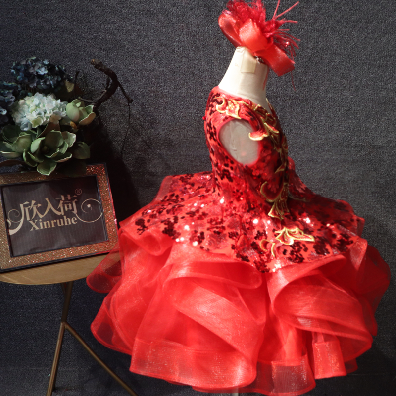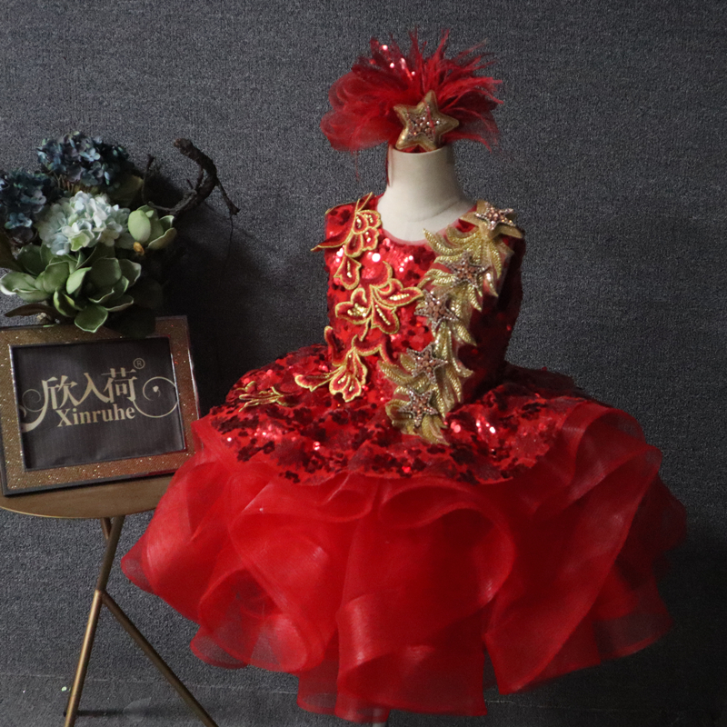 儿童礼服演出服公主蓬蓬裙红色星星六一红歌独唱主持山上红星亮片