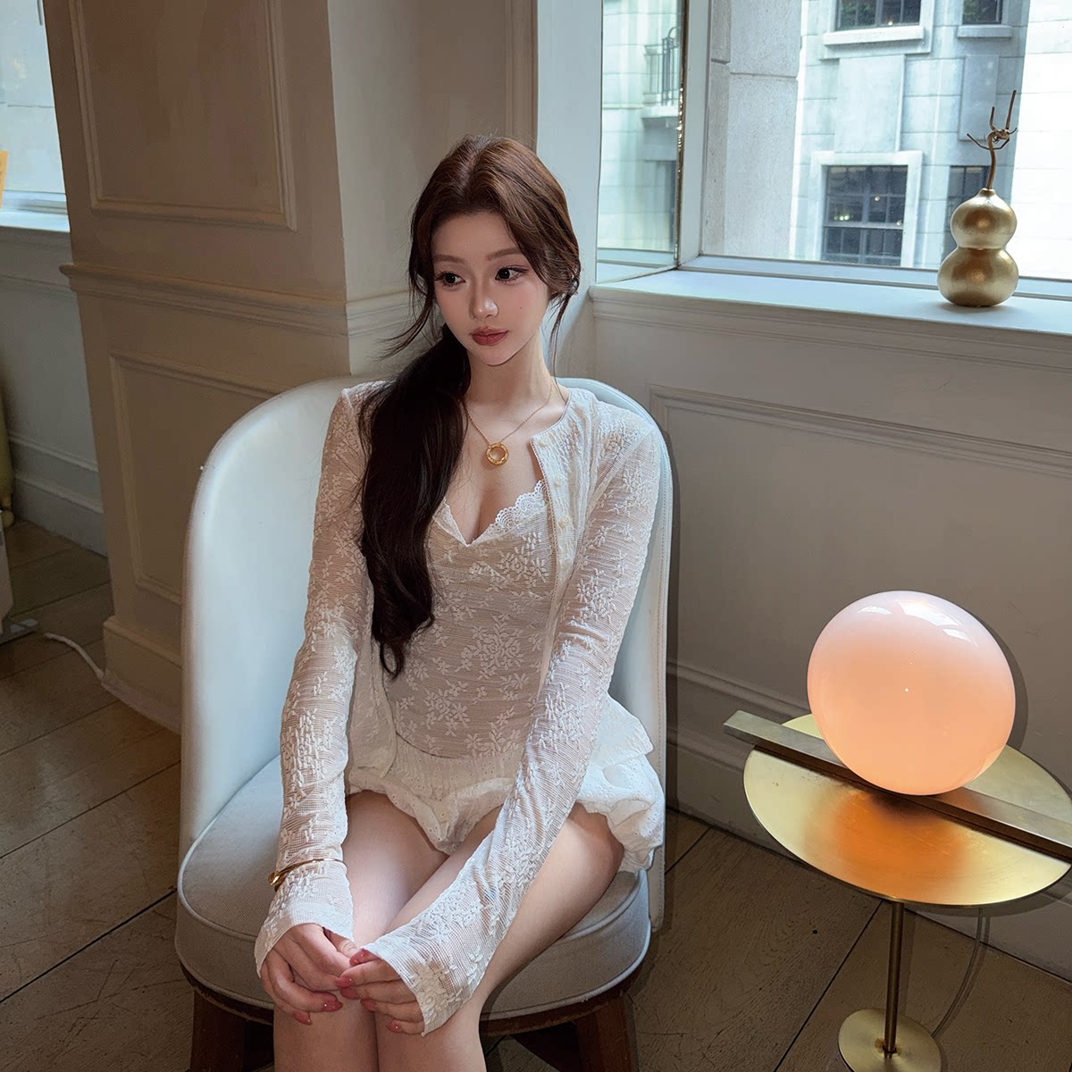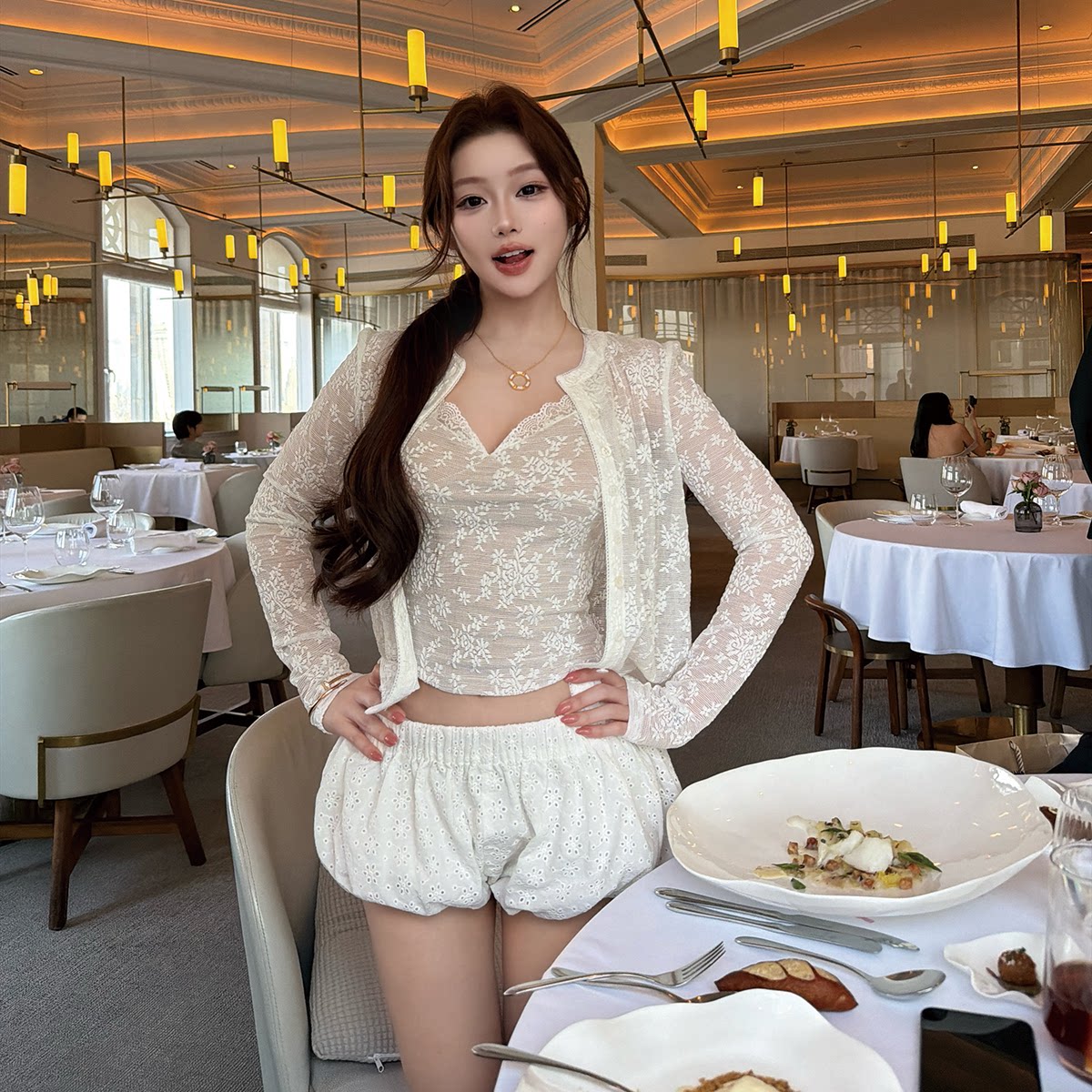 短袖 T恤 百搭开衫 LIN 女新款 气质蕾丝拼接网纱吊带 套装 BOUTIQUE