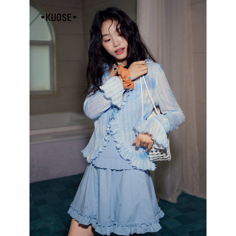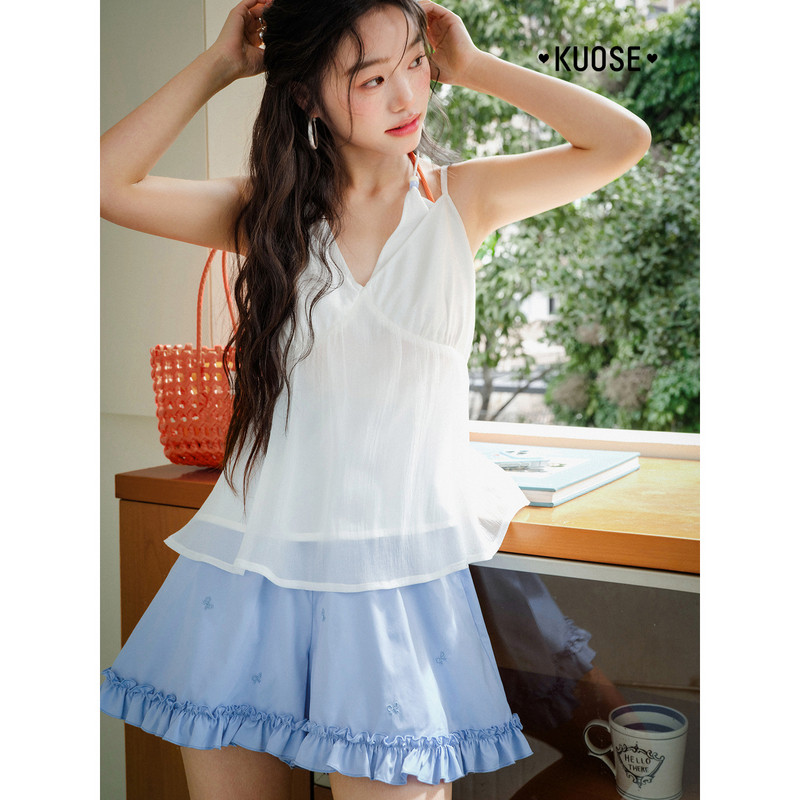 通勤半身裙裤 新款 子女26春夏季 阔色浅蓝色木耳边刺绣阔腿休闲短裤