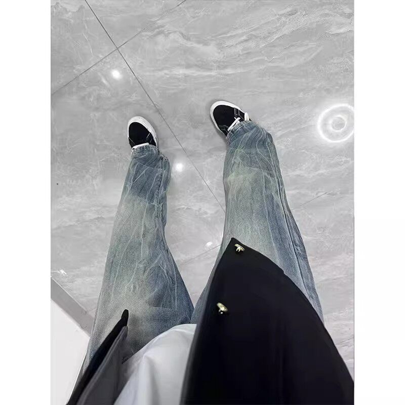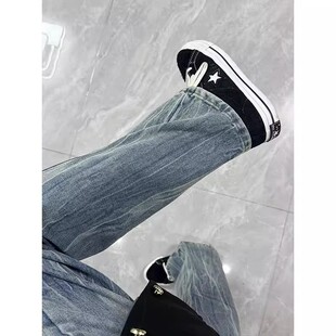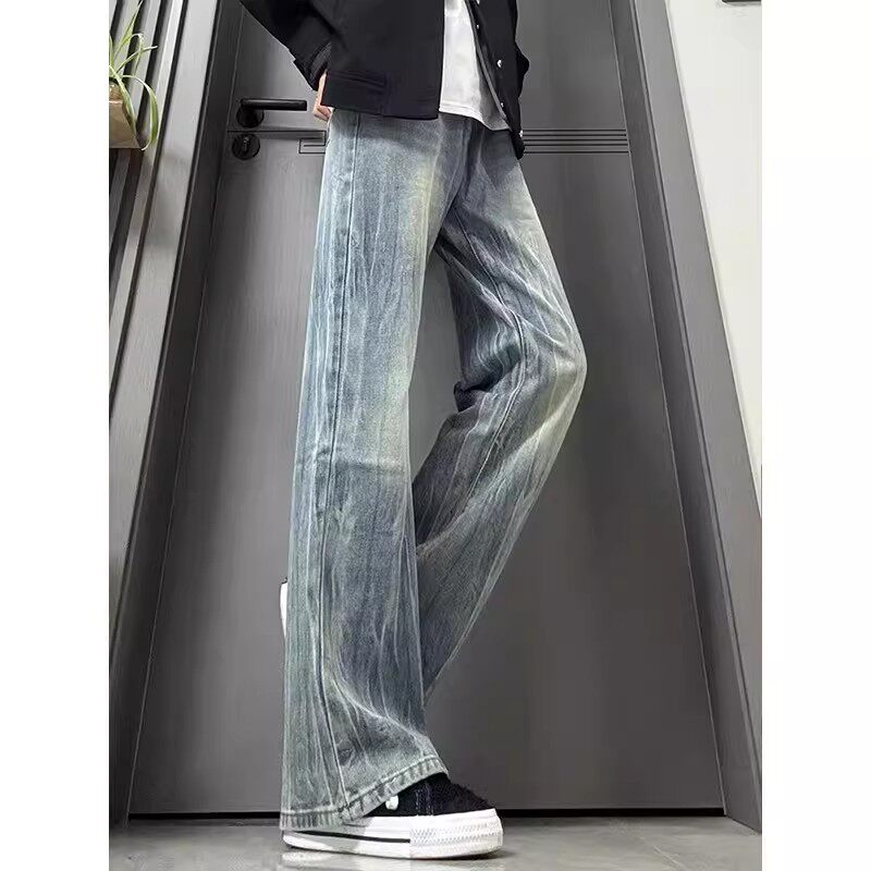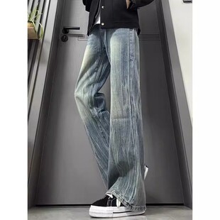 美式 春季 高街vibe裤 子潮牌修身 复古闪电纹牛仔裤 直筒微喇长裤 男款