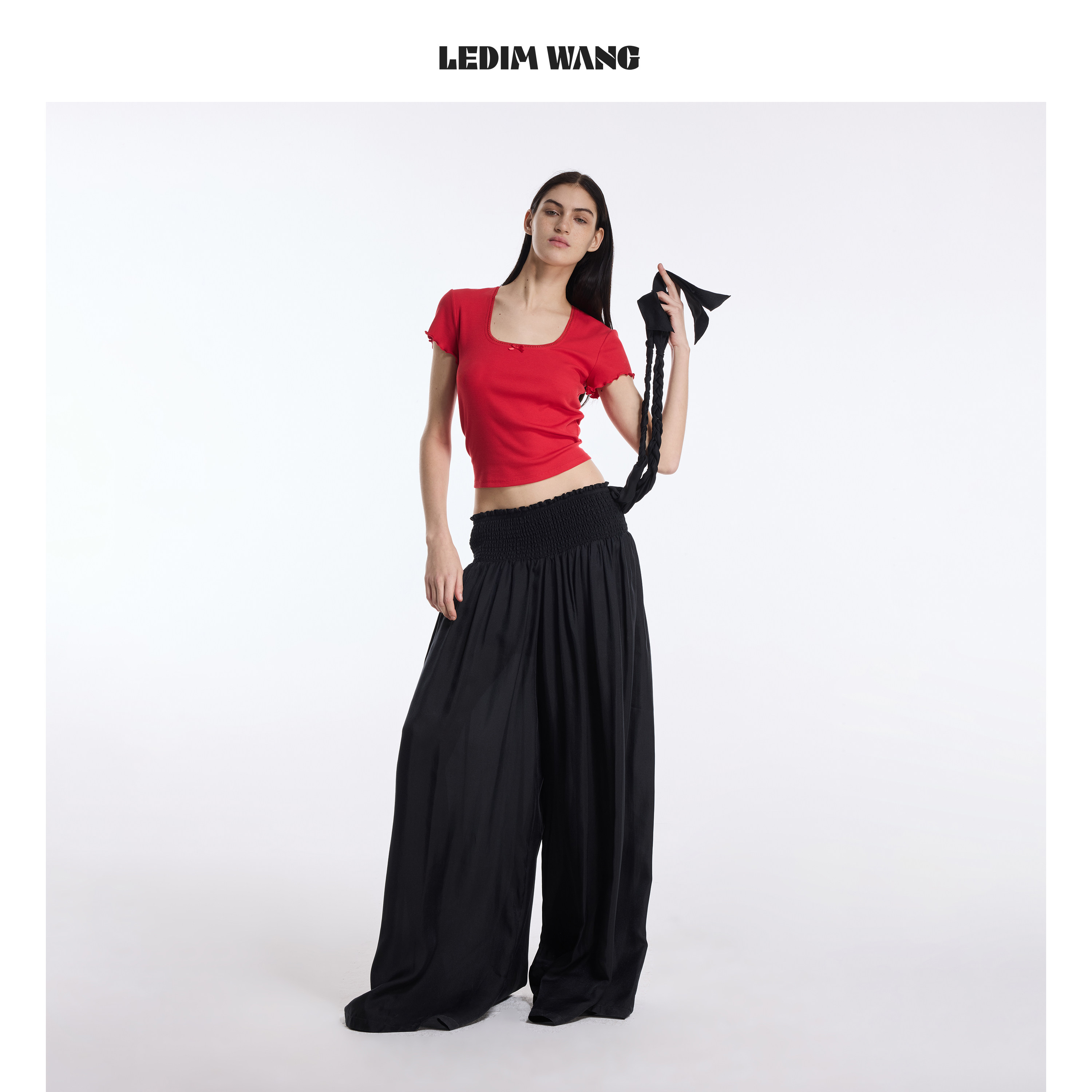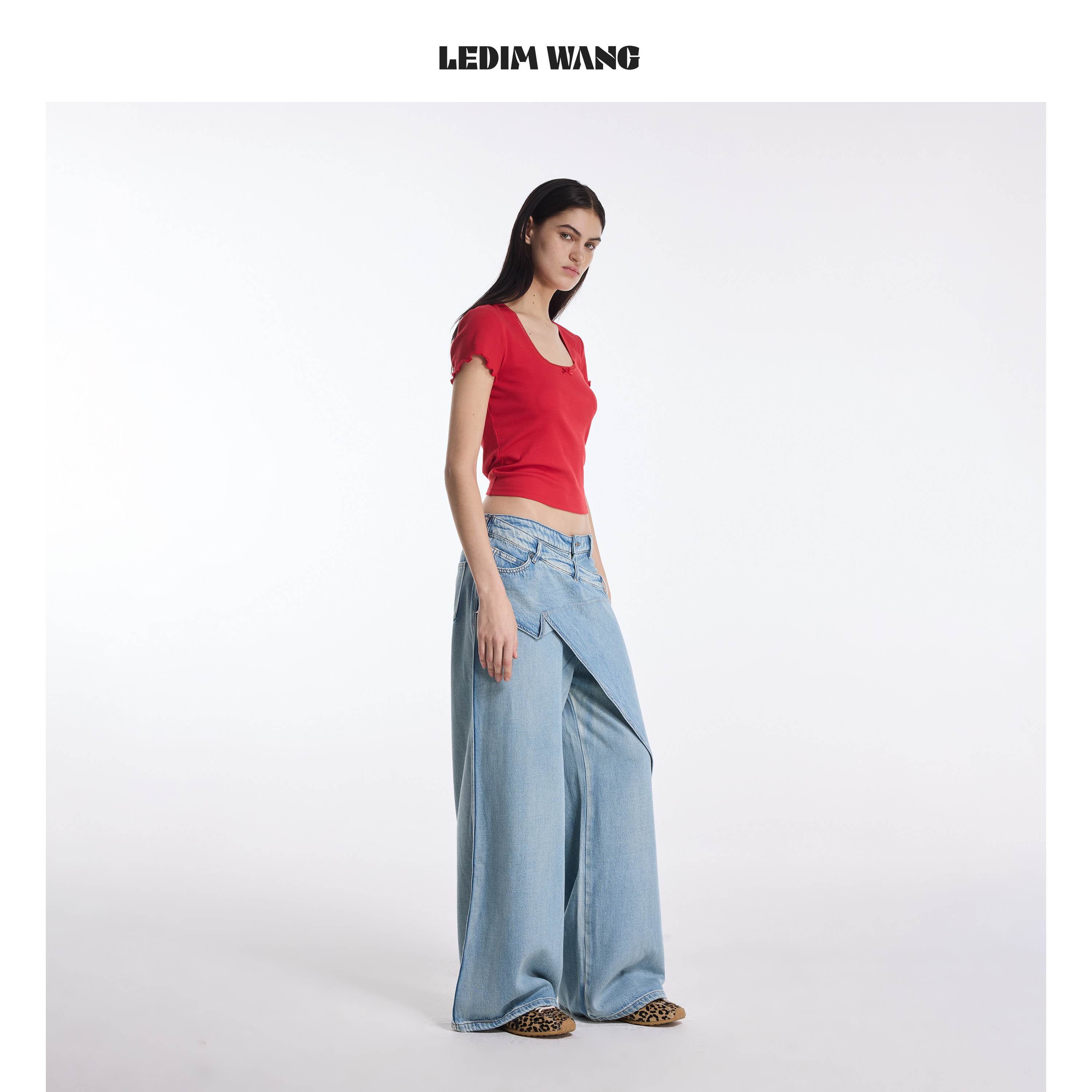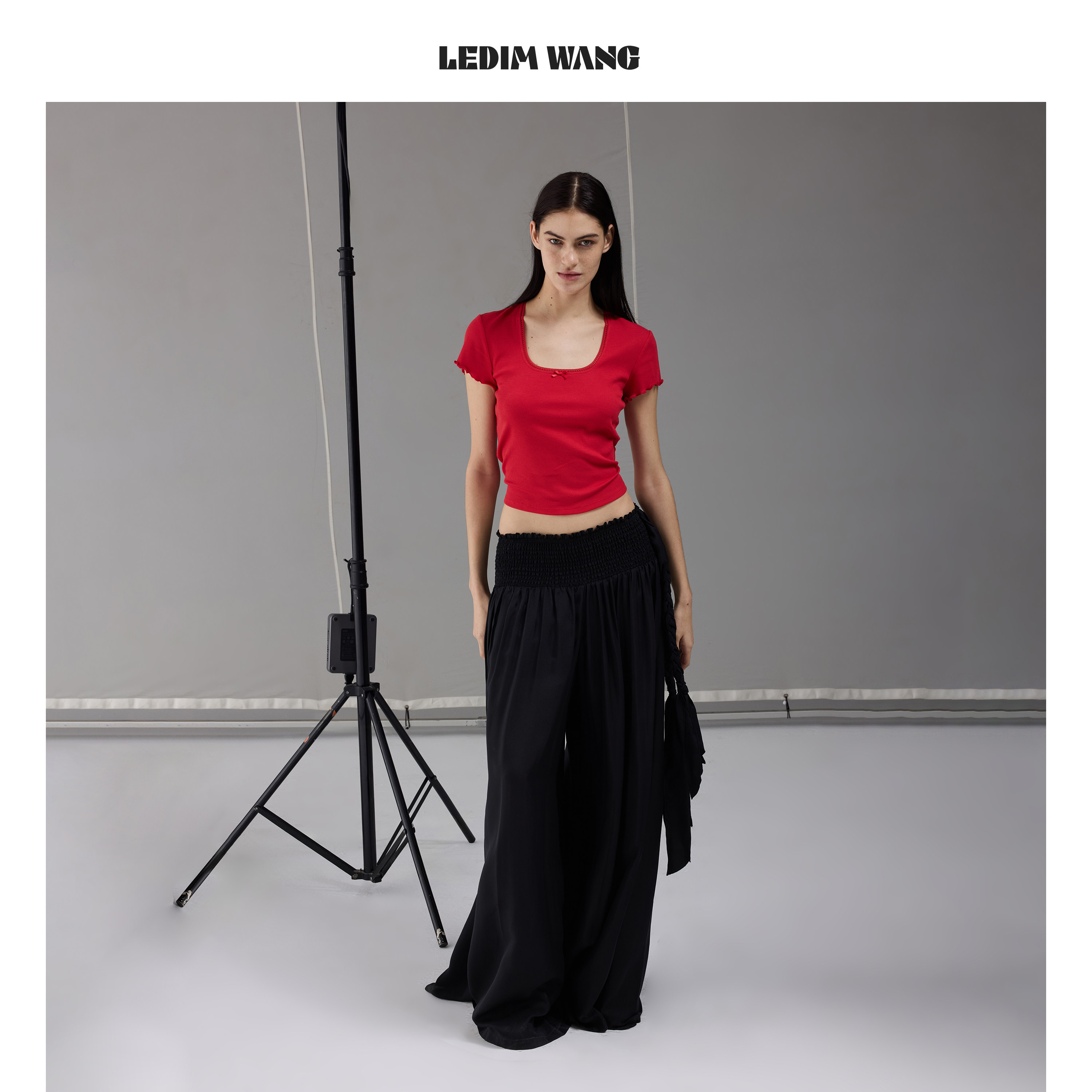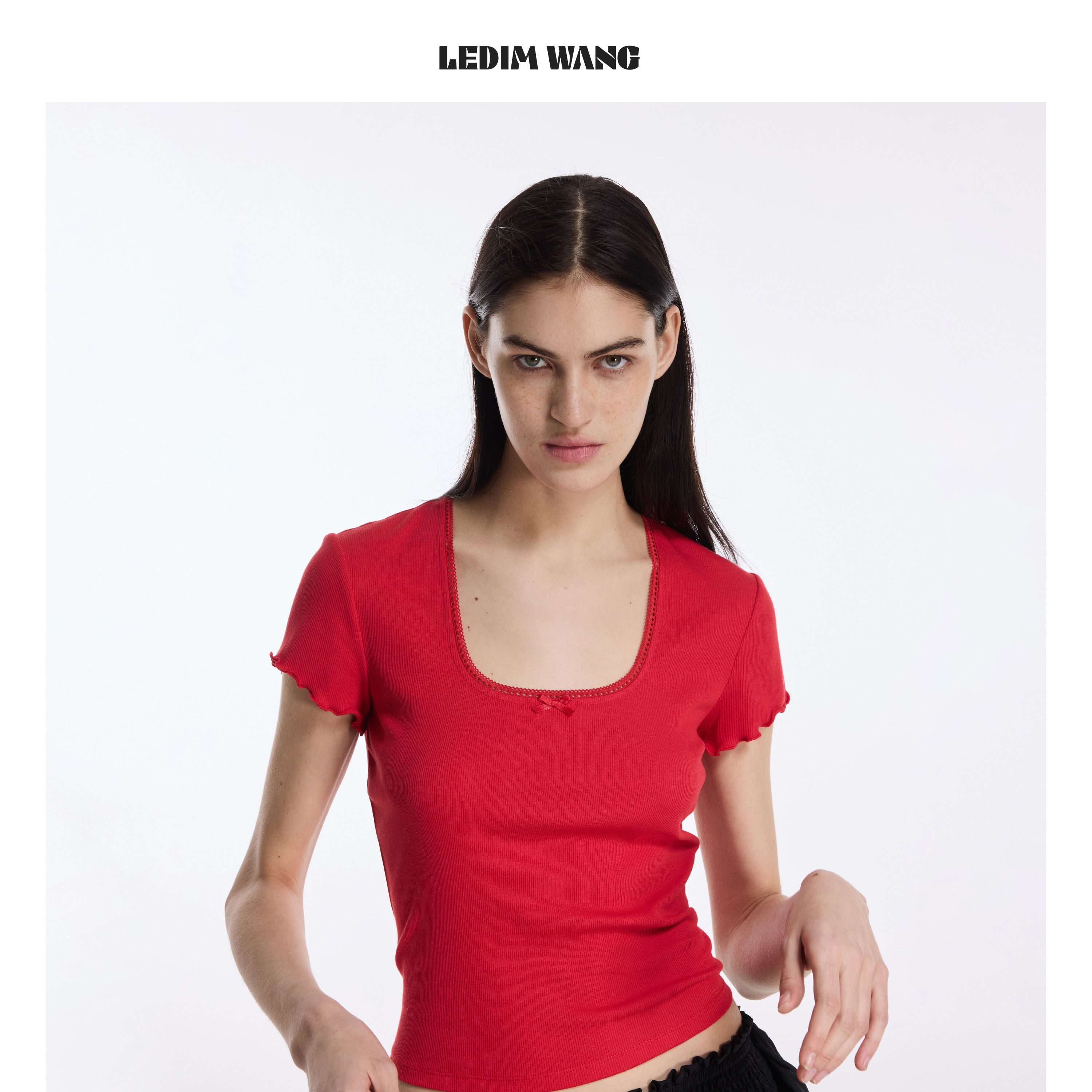 打底上衣 休闲风短款 LEDIM WANG蕾丝边红色T恤女U领2026春夏新款