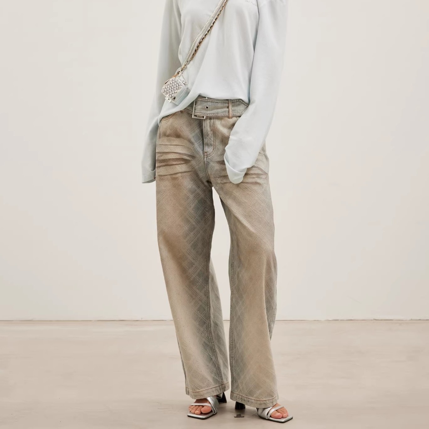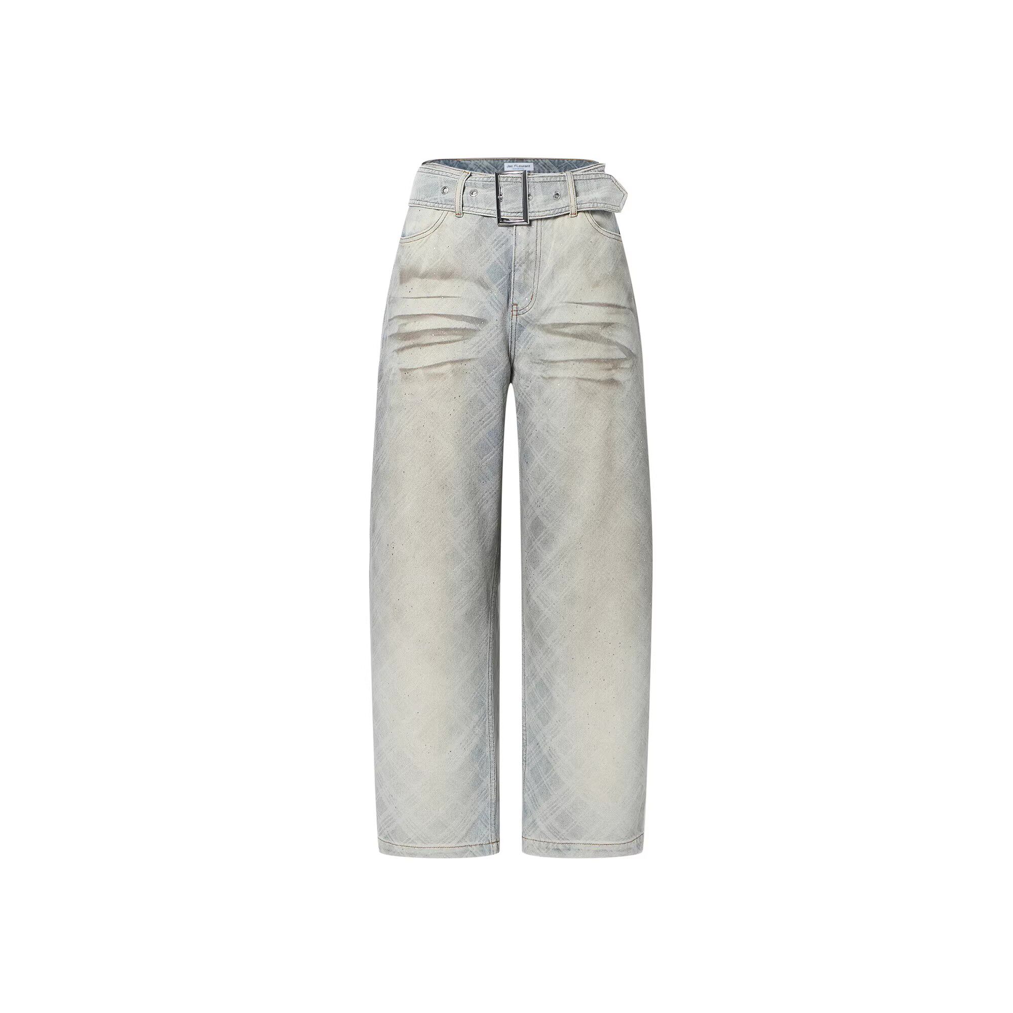 银泰 26春夏女士细钻做旧脏洗格纹弯刀牛仔裤 301489 FLEURANT JAC