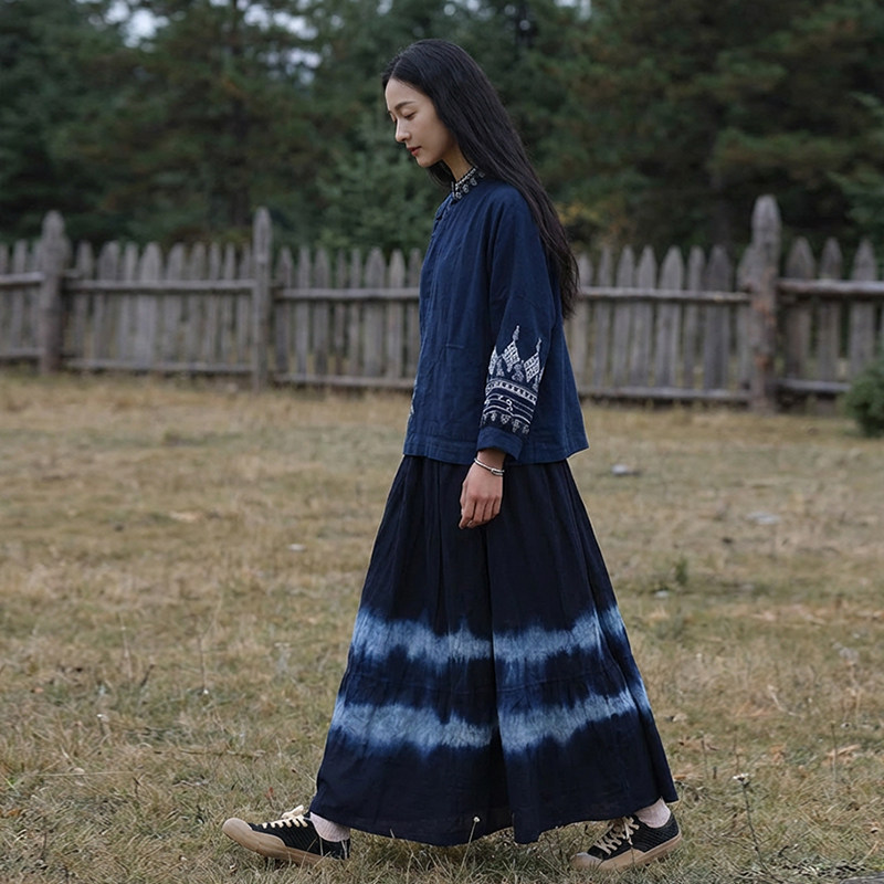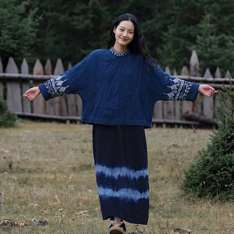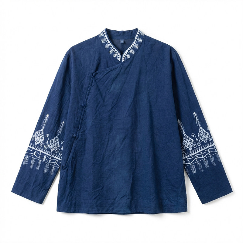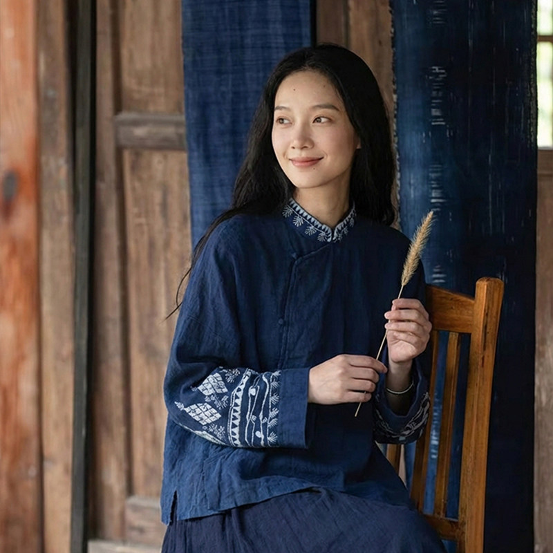 2026春斜襟立领蓝染苎麻长袖 女 上衣 蜡染苎麻衬衫 知笔墨新中式