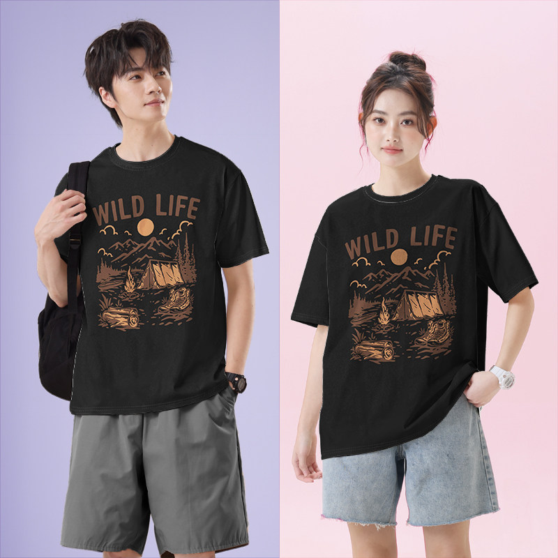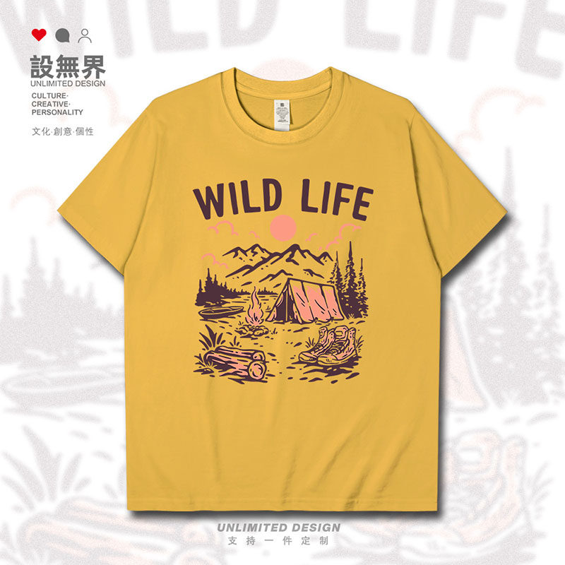 复古山脉户外露营帐篷篝火风景插画短袖 无界 T恤男女圆领短t潮设