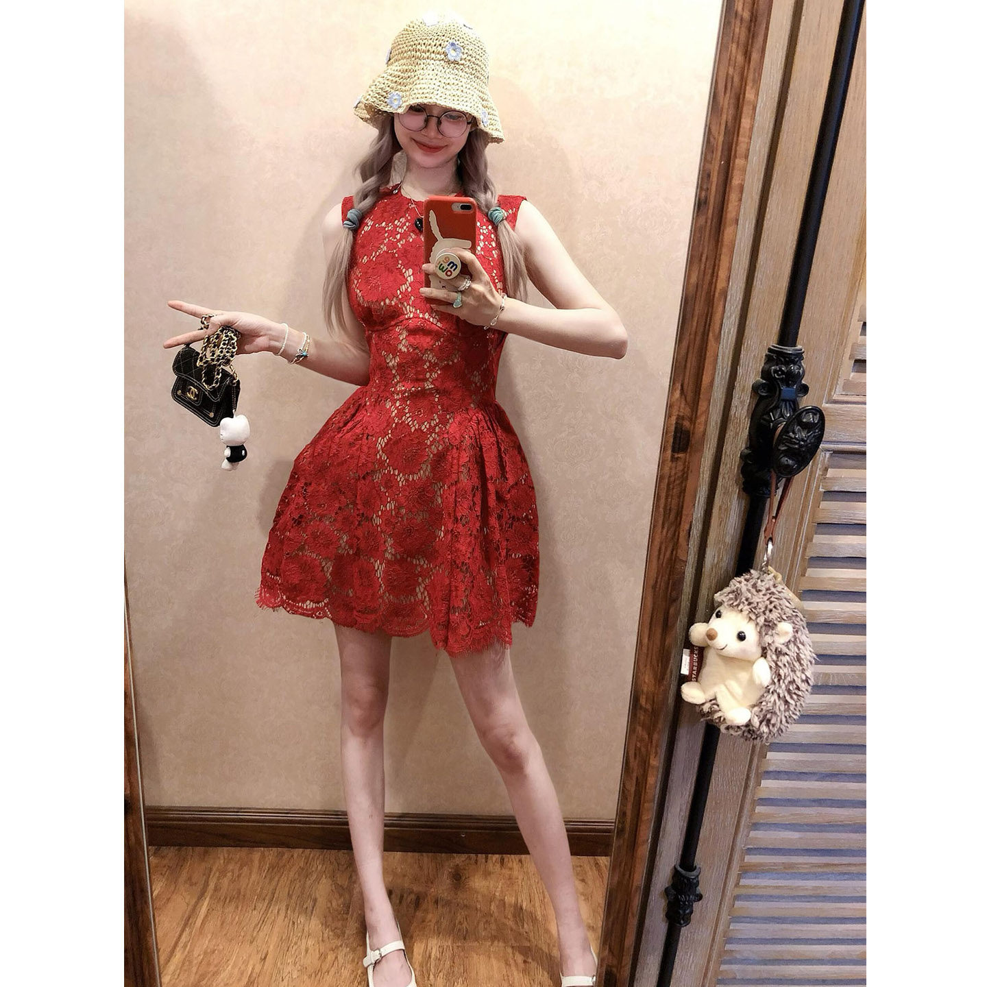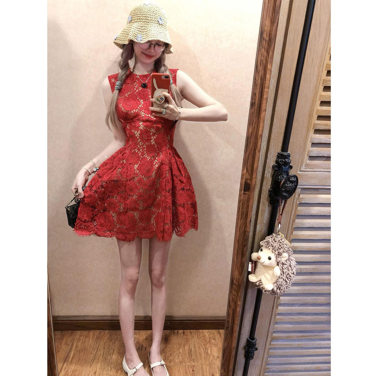 收腰镂空无袖 气质重工红色蕾丝连衣裙女26年夏季 短裙 微胖法式 XZY