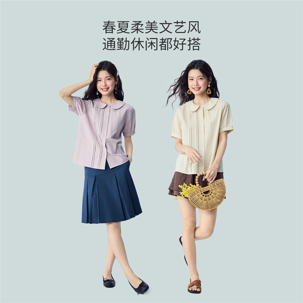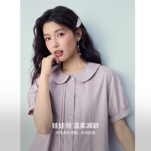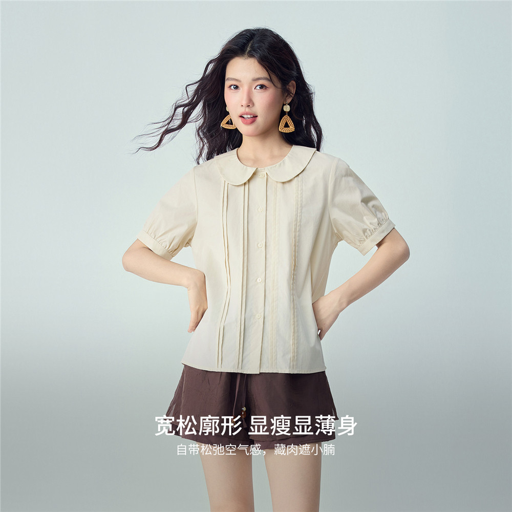 衬衫 纯棉宽松压褶娃娃领泡泡短袖 女13346215 新款 佐丹奴2026年夏季