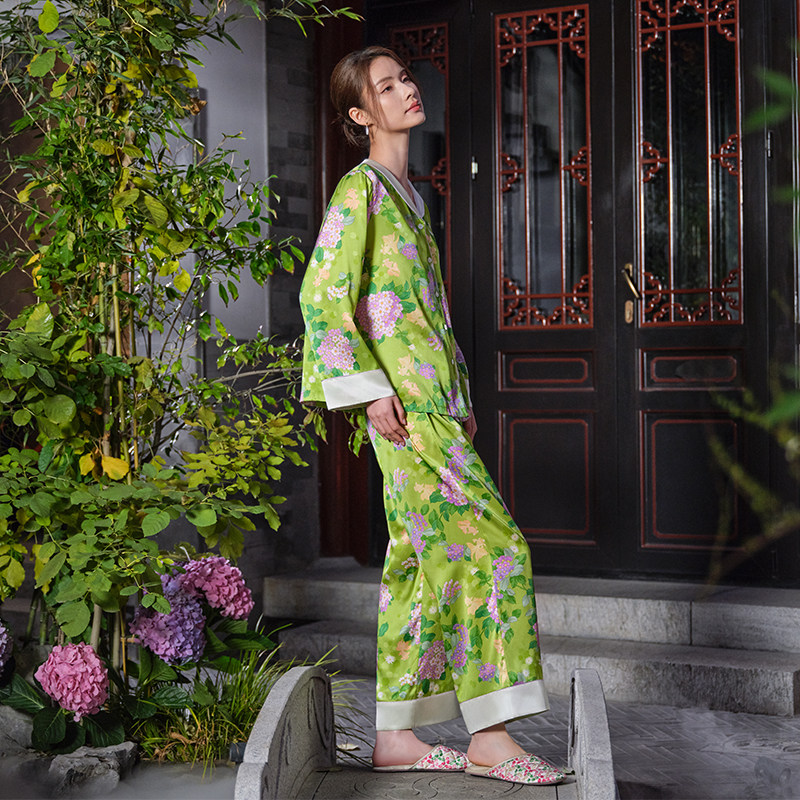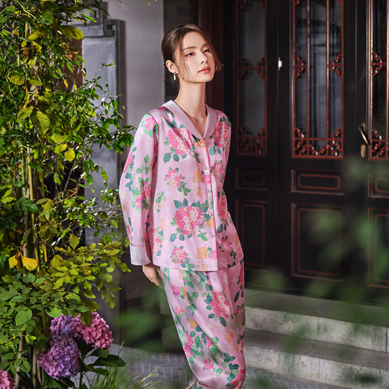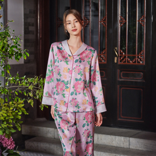 爱慕皇锦睡衣女真丝开襟长袖 金玉满堂HJ21566 分身套装
