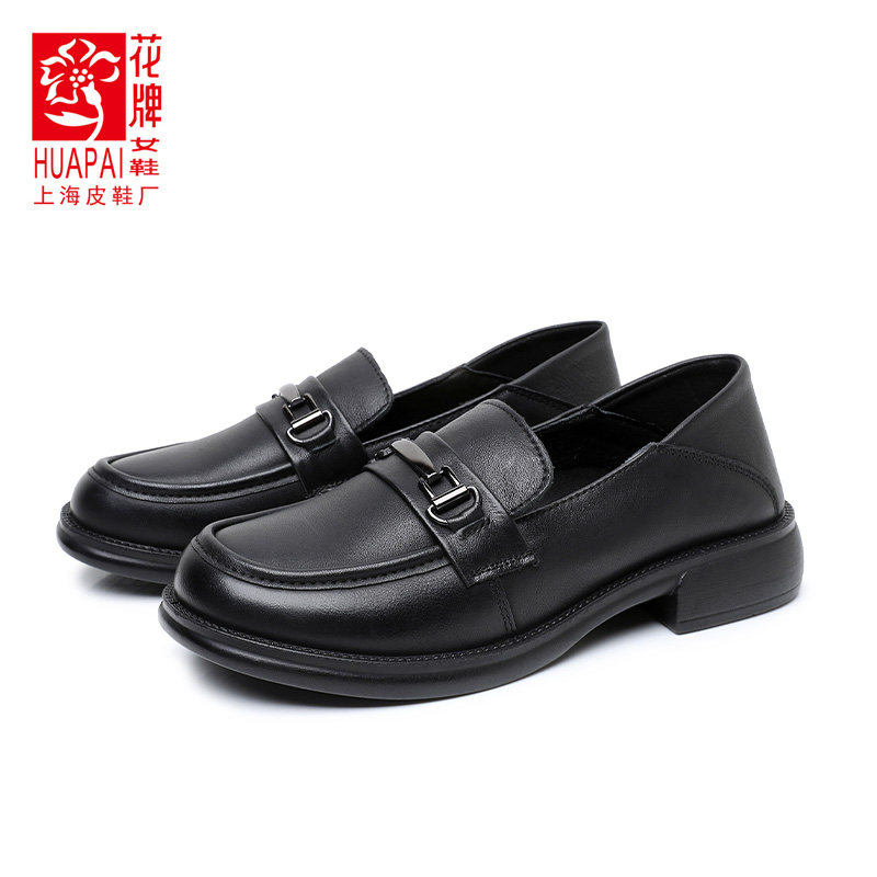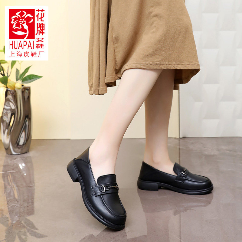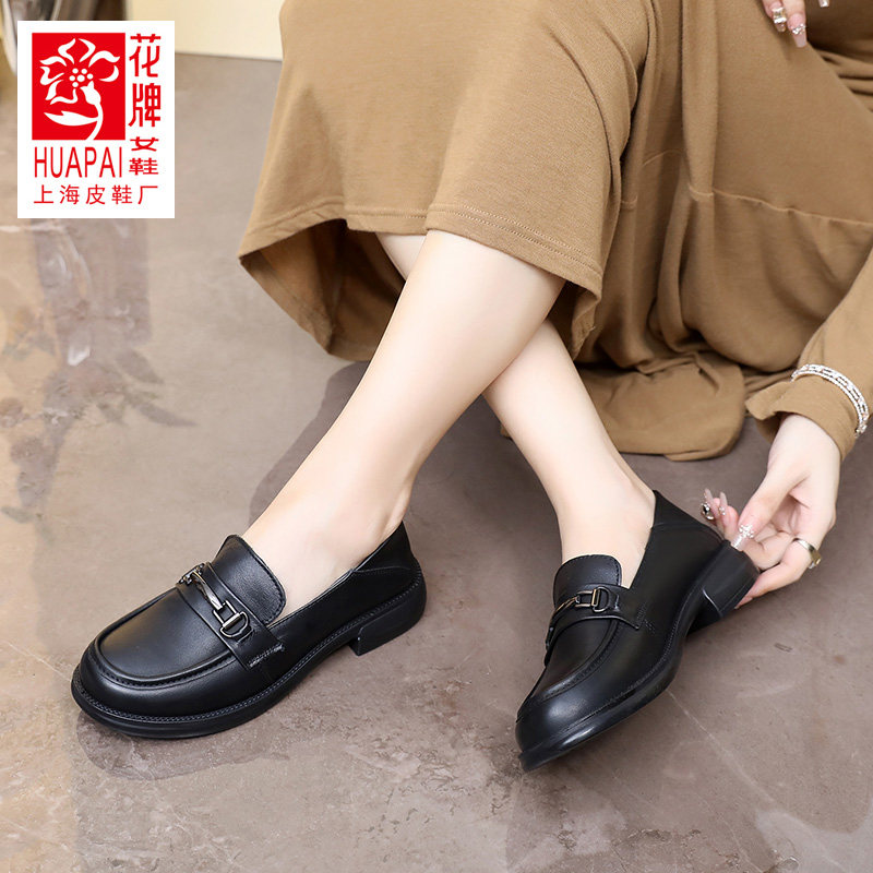 英伦风圆头乐福真皮一脚蹬黑色低跟单鞋 上海花牌女鞋 2026春新款