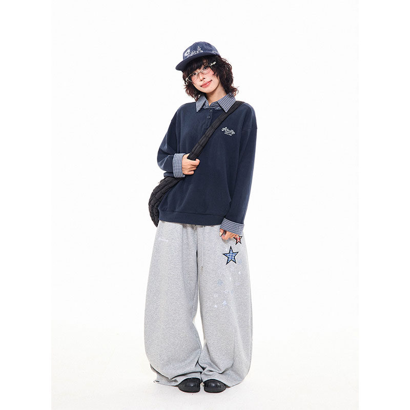 女街头宽松bf慵懒风百搭弯刀阔腿裤 美式 复古格纹星星抽绳休闲卫裤