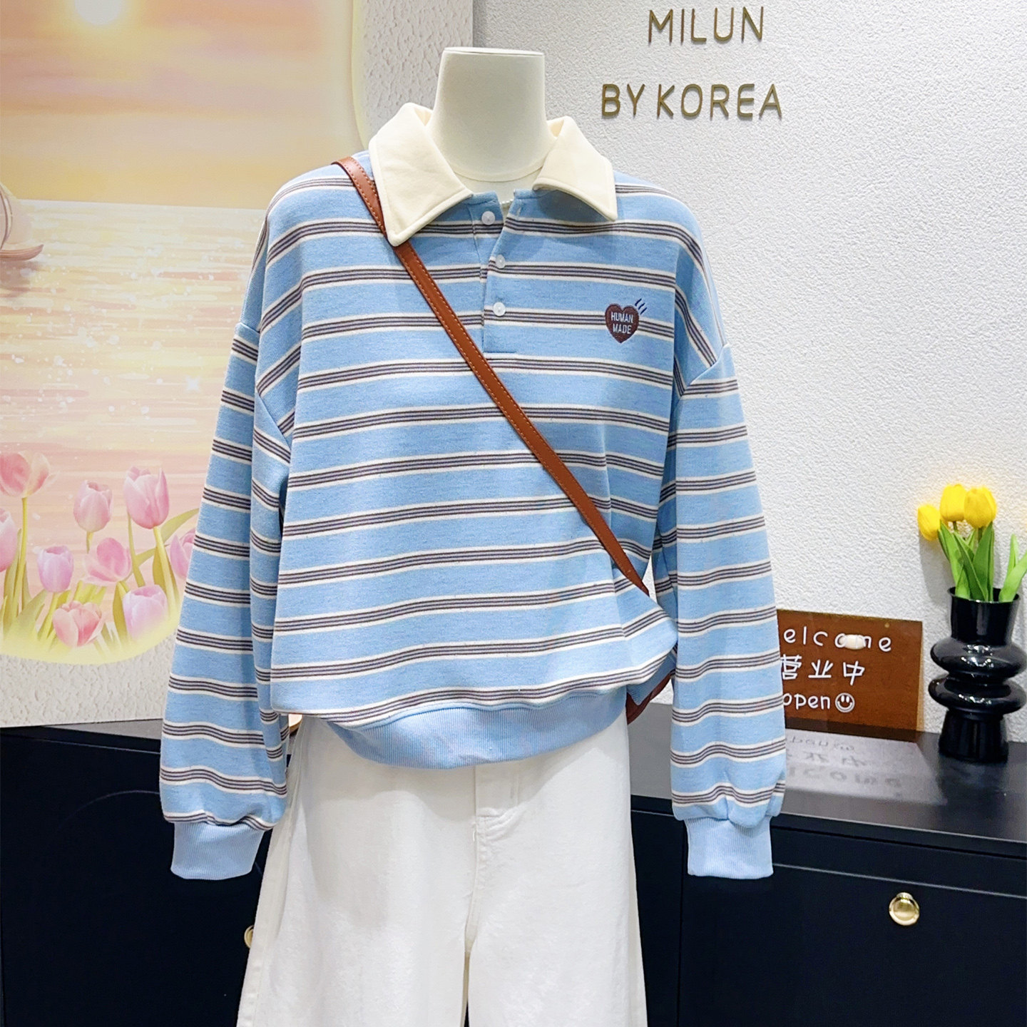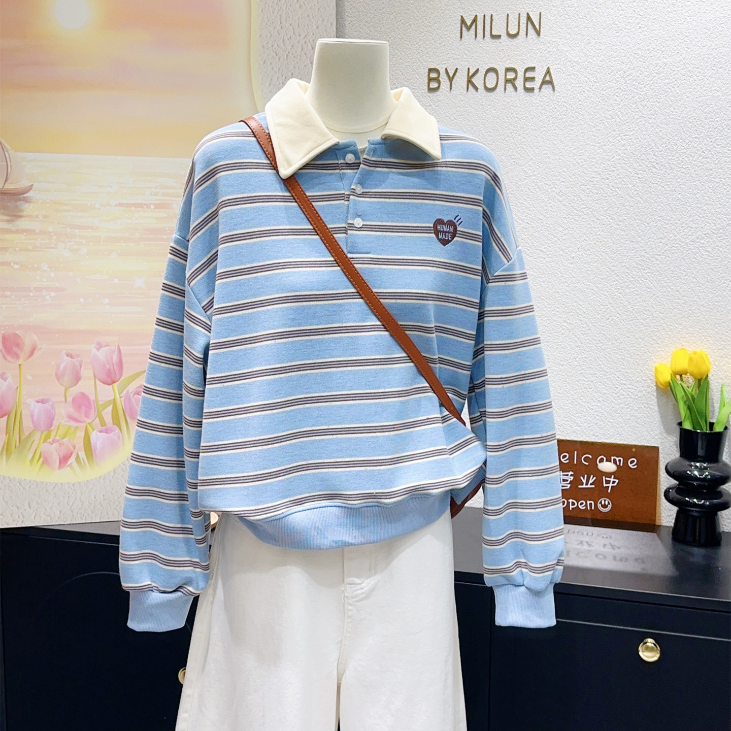 清新氧气感显瘦显高 韩国单复古Miu系撞色翻领条纹卫衣女 2026春季
