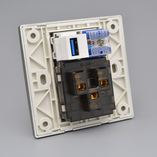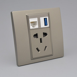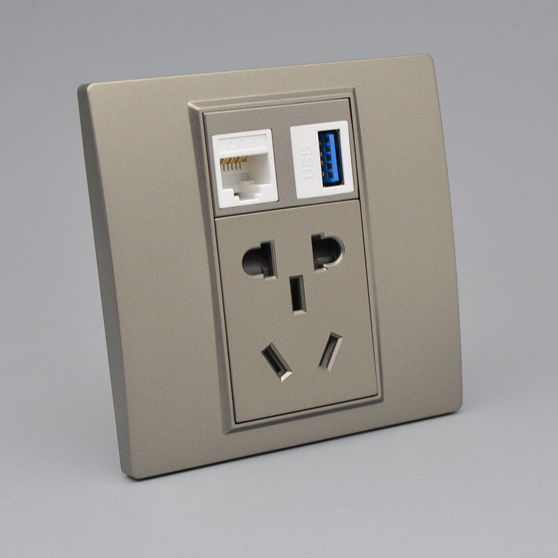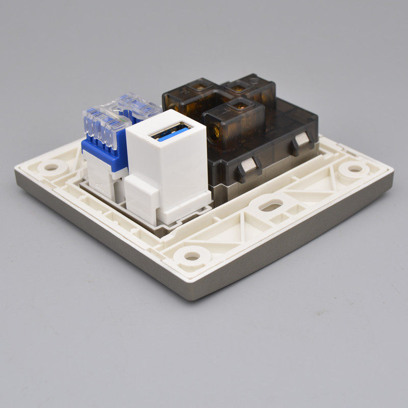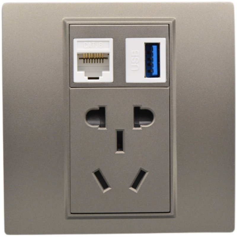 深灰色六类网络USB数据接口带五孔电源插座5孔加千兆电脑网线面板