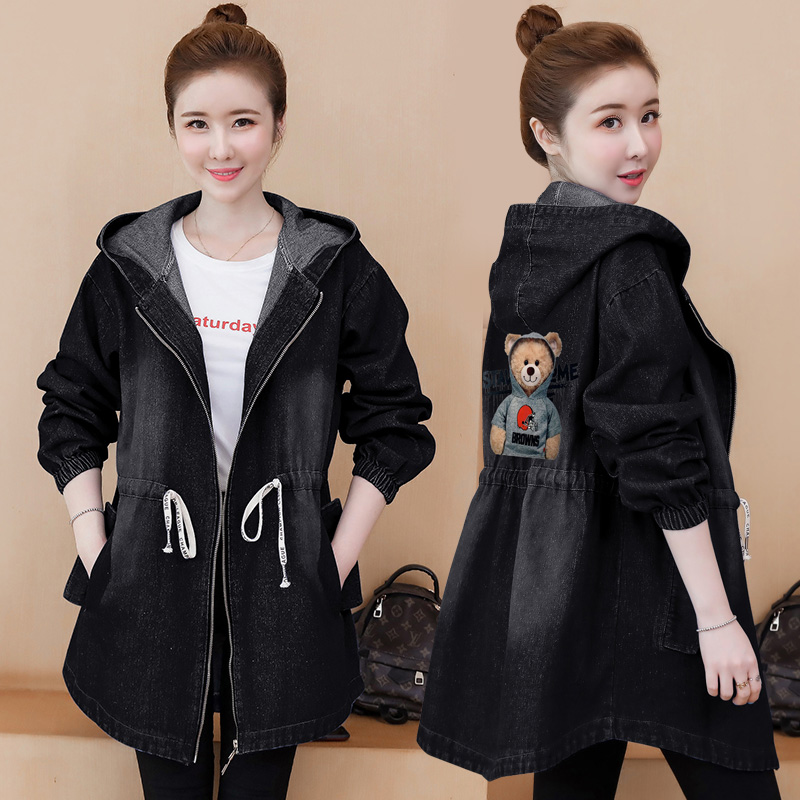 韩版 牛仔外套女士中长款 胖MM黑色抽绳收腰显瘦风衣潮 大码 春秋新款