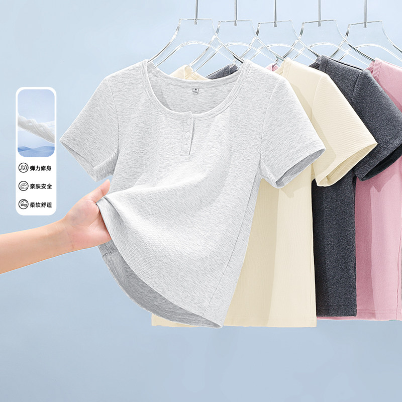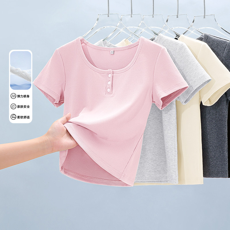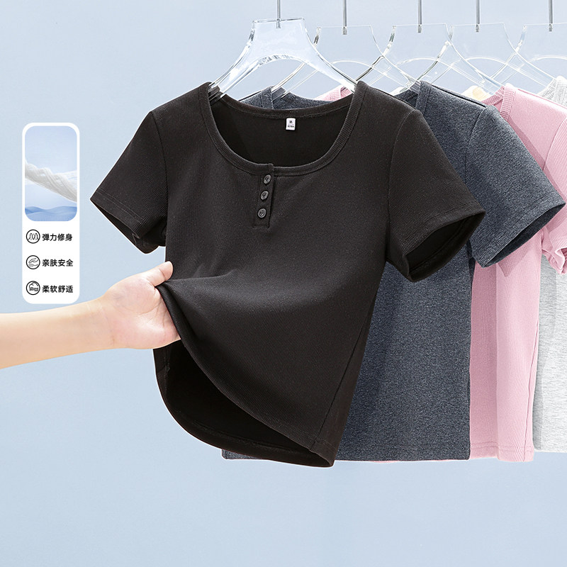 上衣H 纽扣设计感短款 班尼路S&K系列方领正肩短袖 T恤女夏2026新款