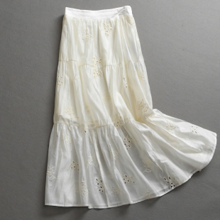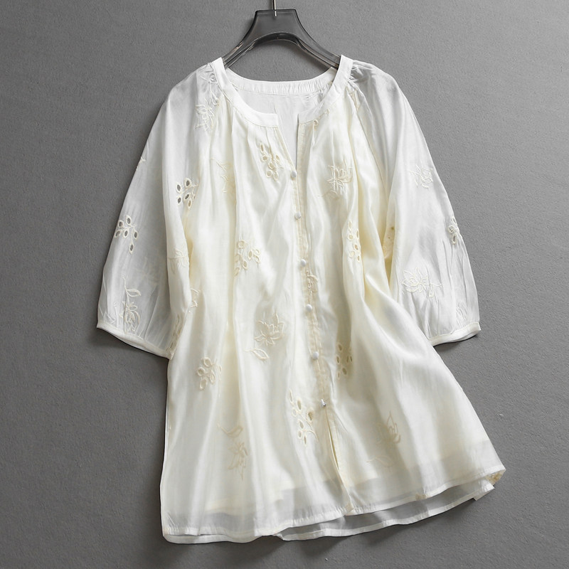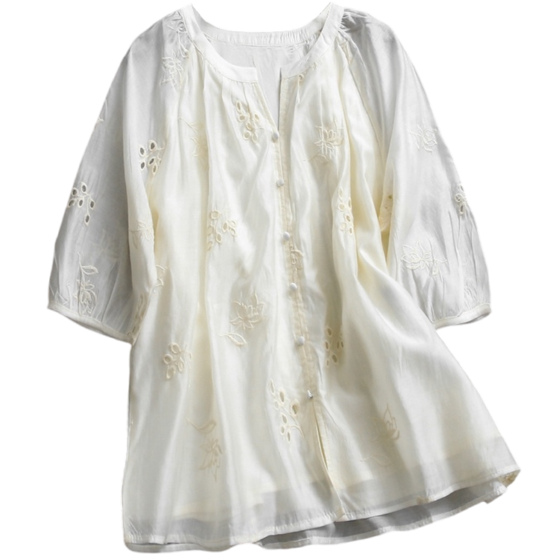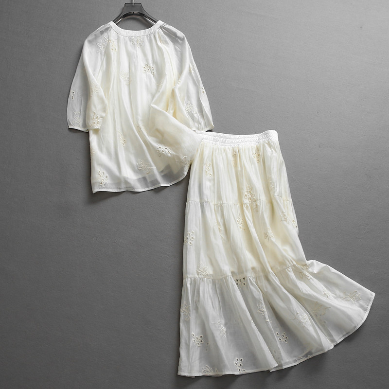L454 一整套穿搭半裙女两件套装 刺绣镂空宽松显瘦半开领五分袖 衬衫