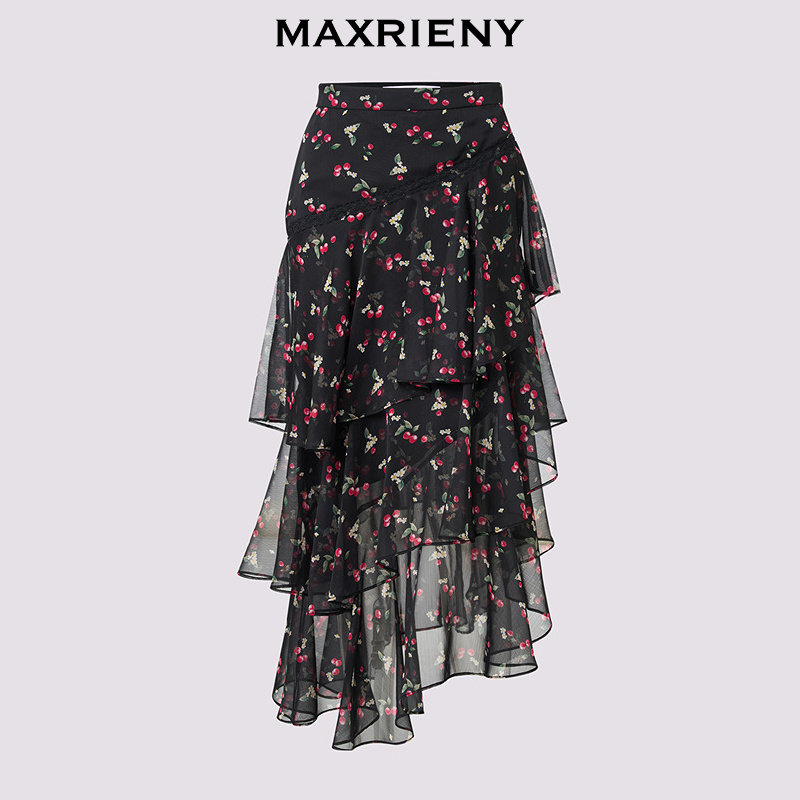 精致浪漫半身裙层叠波浪裙 MAXRIENY樱桃黑巧套装 萨顶顶同款