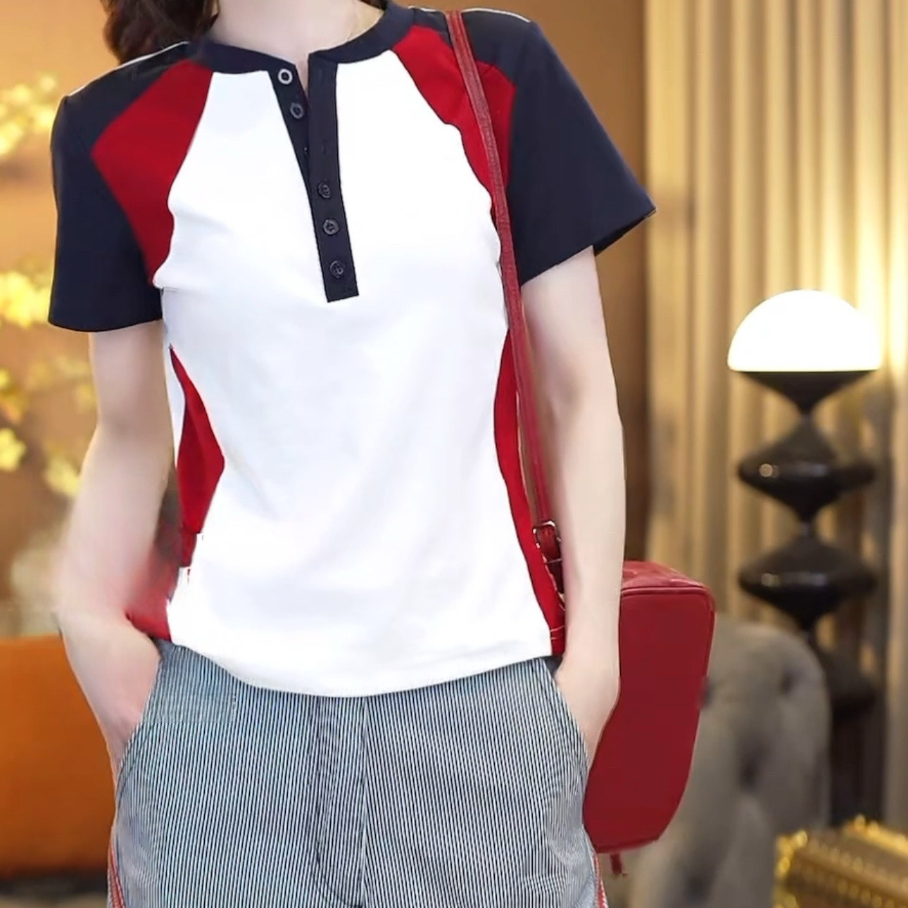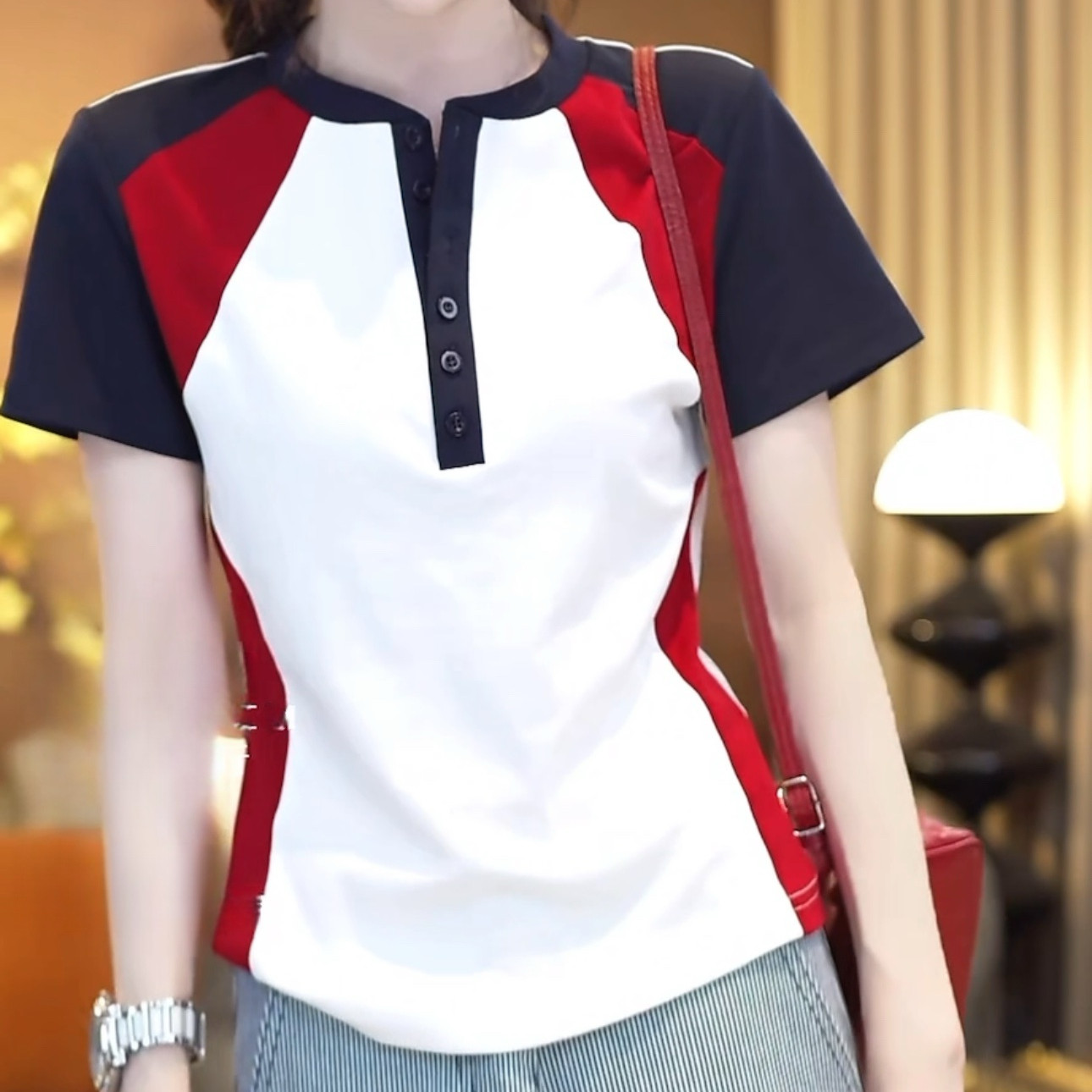 撞色拼接短袖 修身 T恤女2026夏季 时尚 显瘦纯色半纽扣上衣 新款 美式