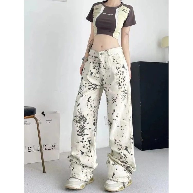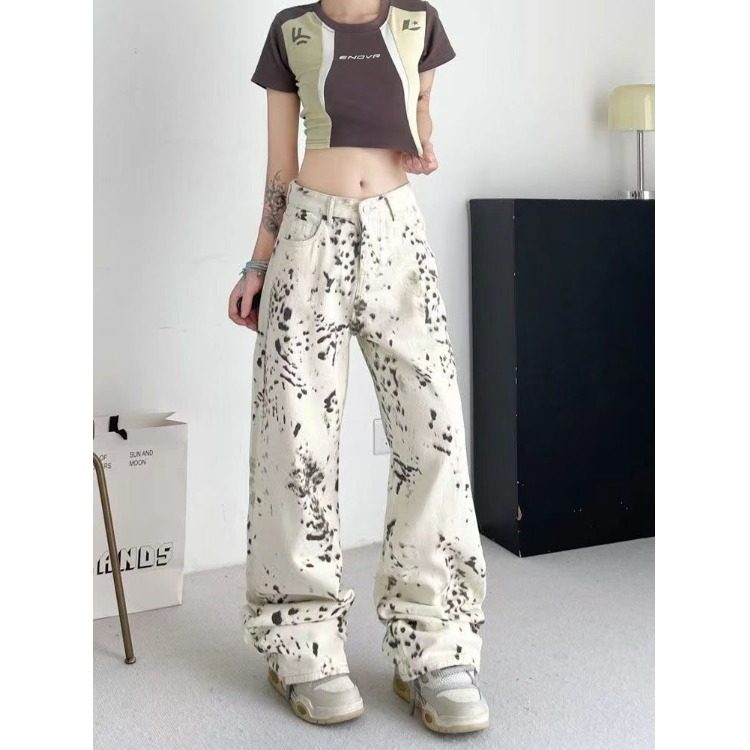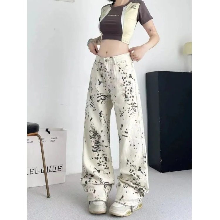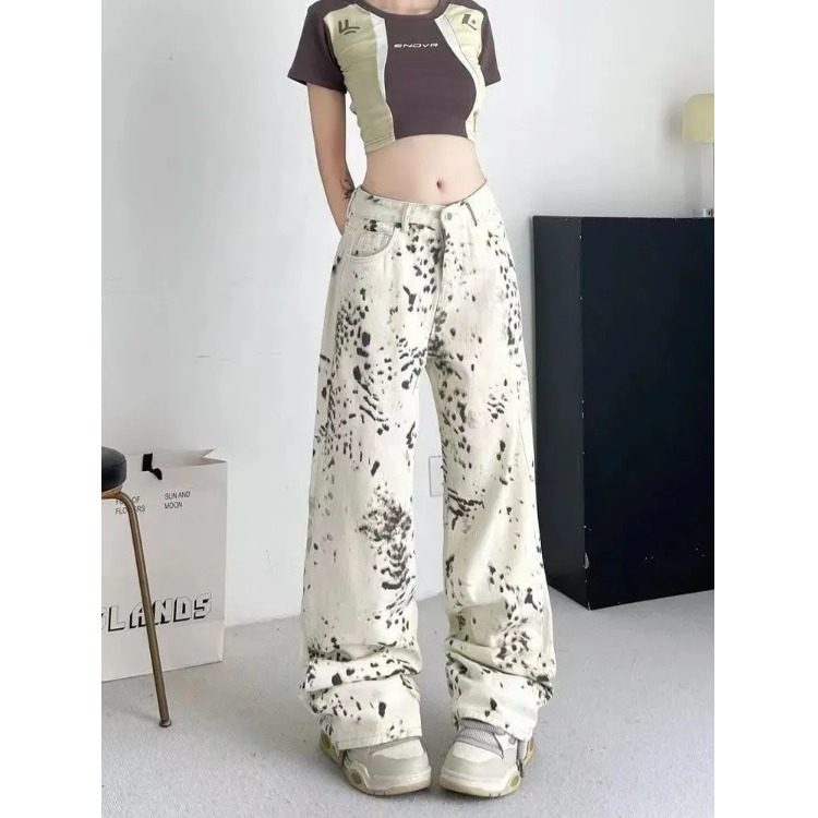 显瘦高腰阔腿裤 豹纹裤 2025新款 女春秋季 子宽松bf慵懒风 白色牛仔裤