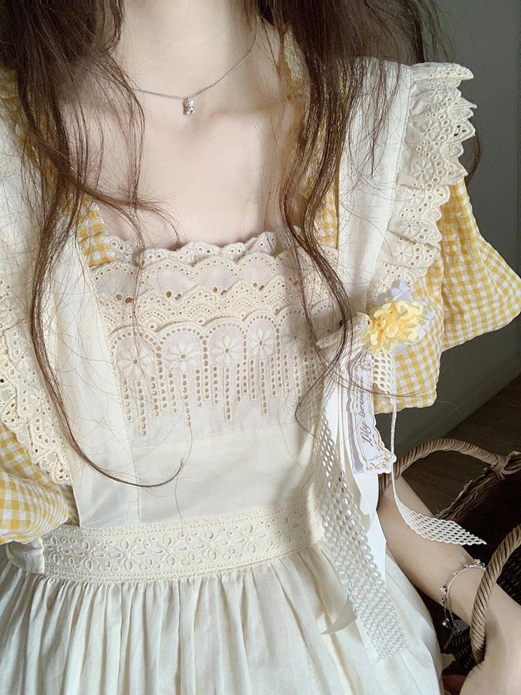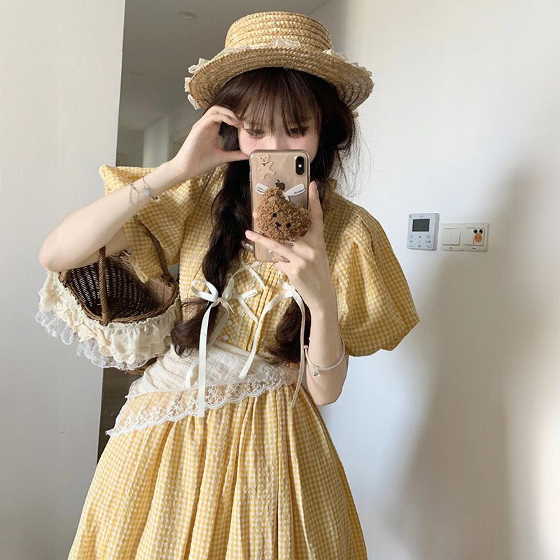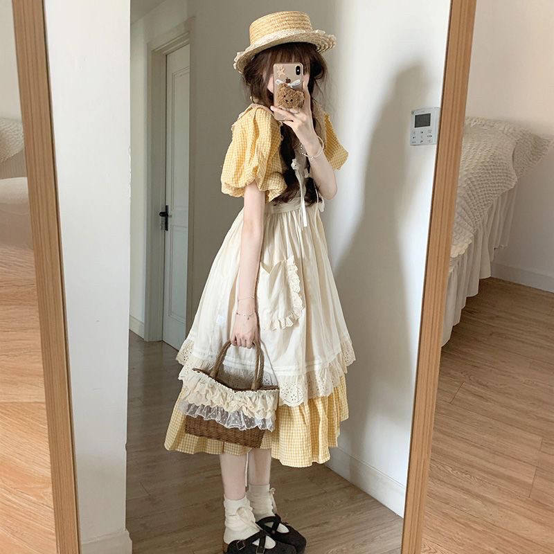 热爱森系田园风日常轻lo格纹洛丽塔Lolita连衣裙女套装 送蕾丝头巾