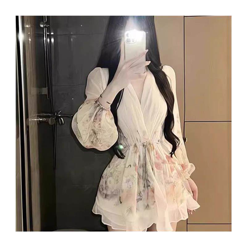 大码 连衣裙女春夏纯欲绝美气质收腰蓬蓬短裙 微胖V领碎花雪纺长袖