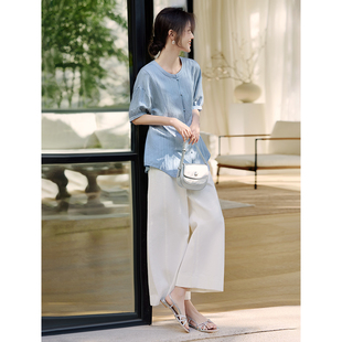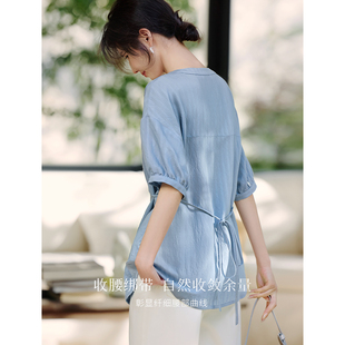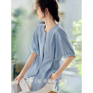 简约蓝色收腰上衣空调衫 女春夏季 通勤高级感肌理衬衫 XWI欣未法式