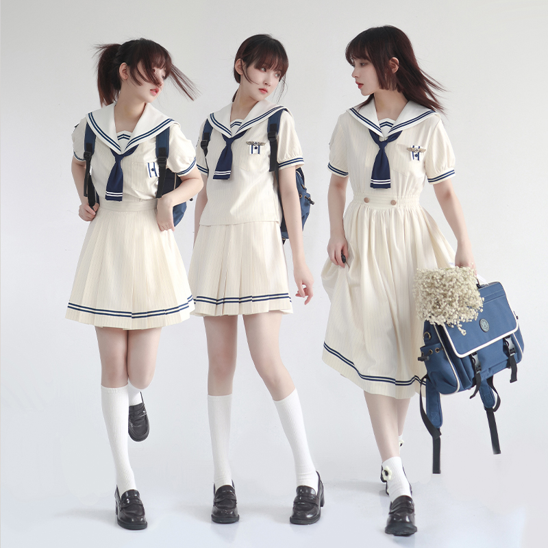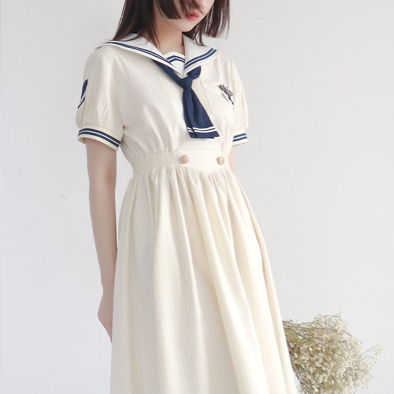 轻复古少女条纹连衣裙 去海边 原创水手服盛夏服 夏日和风铃