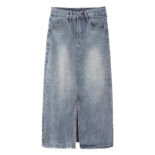 遮胯a字包臀裙 春秋中长款 高腰开叉牛仔半身裙女2023大码 胖mm新款