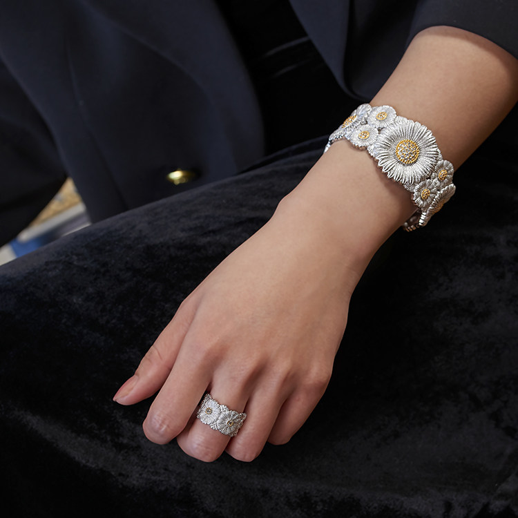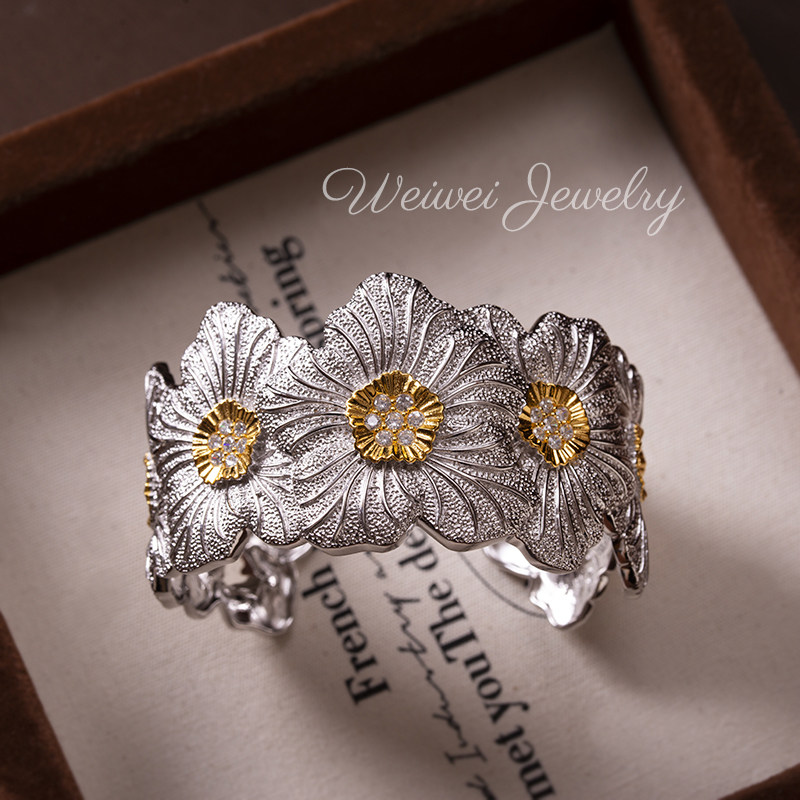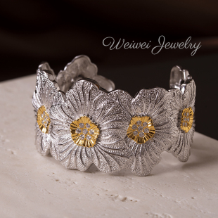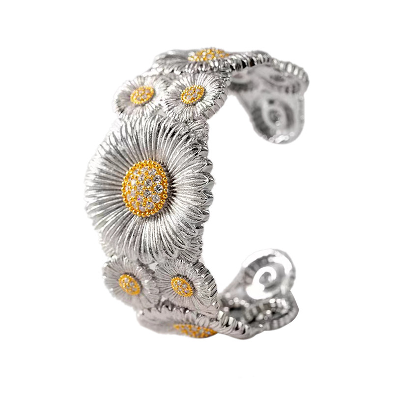 欧美复古小众意大利拉丝工艺925纯银女镶嵌栀子花雏菊开口手镯
