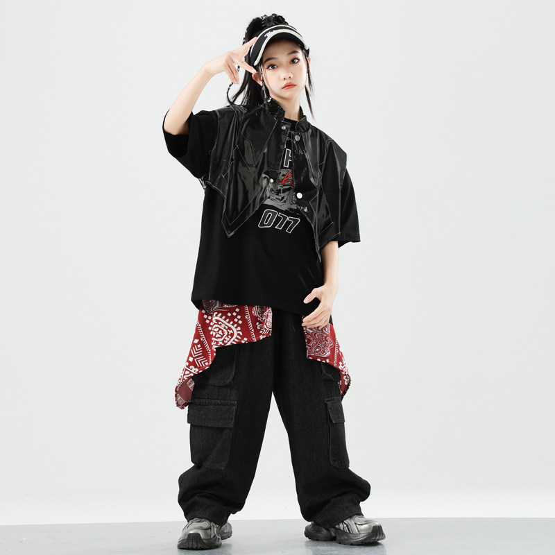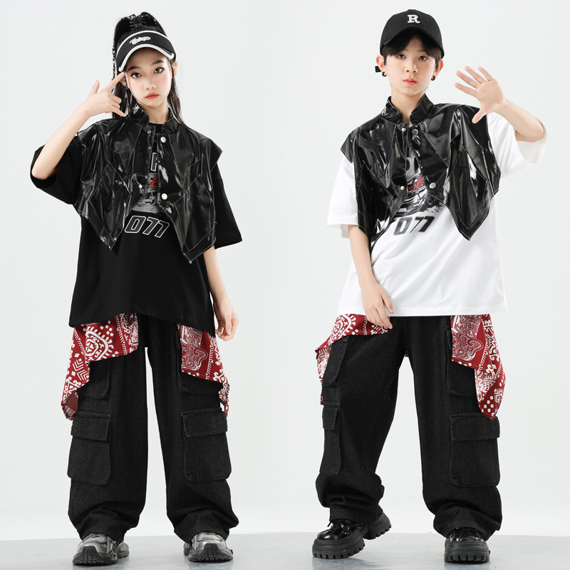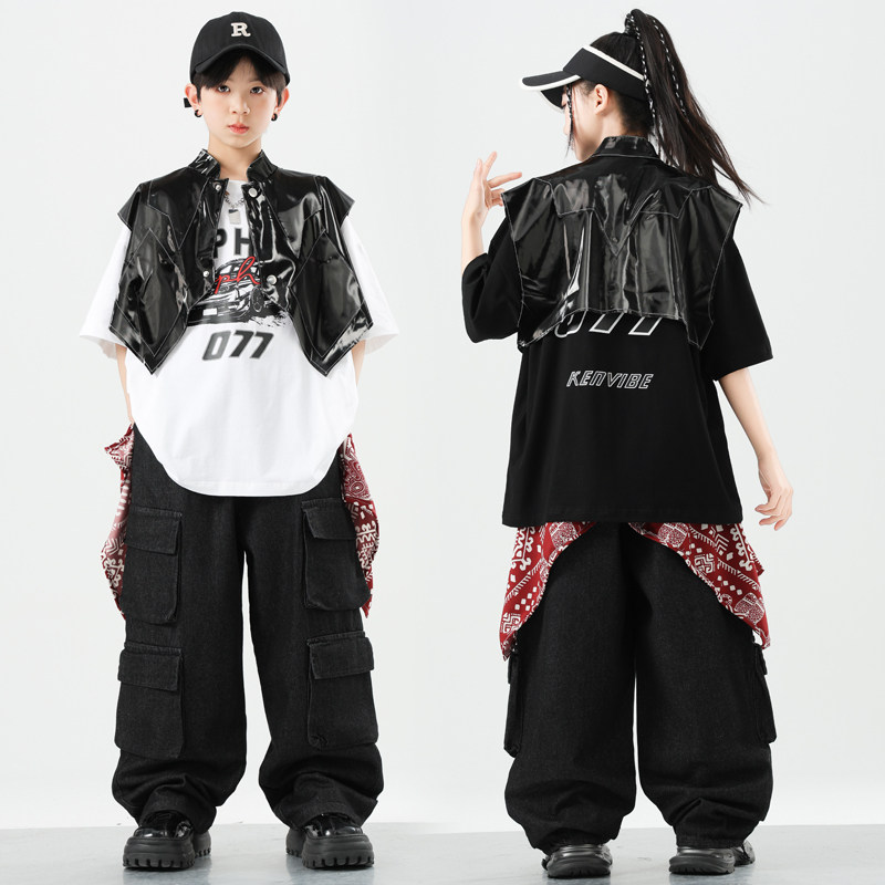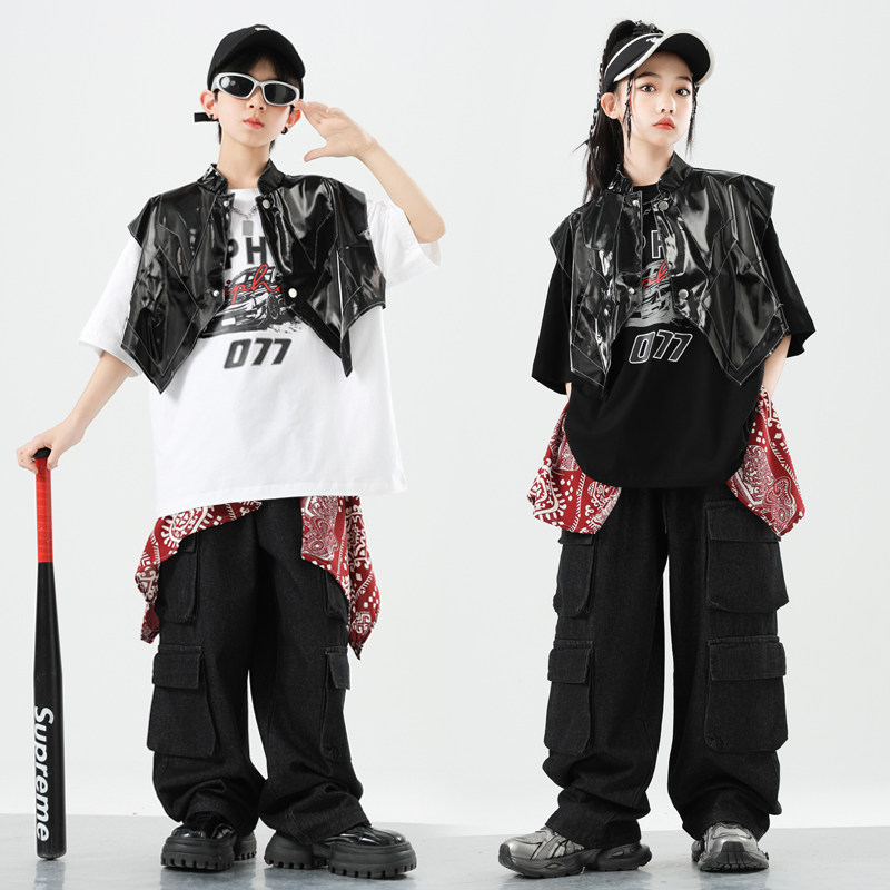 儿童街舞潮服演出服男女童嘻哈爵士皮衣马甲套装 hiphop表演服套装
