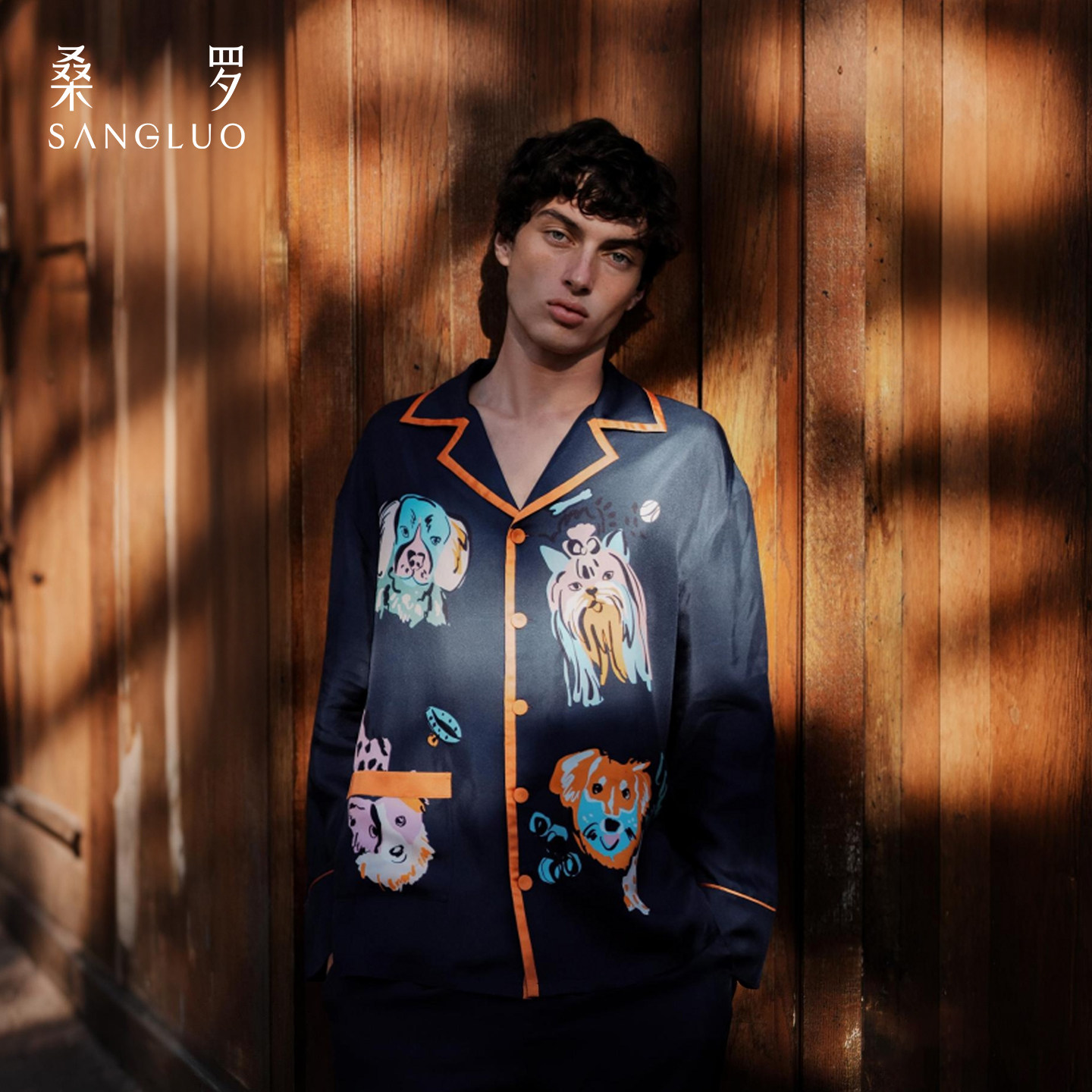 魔法小狗 藏青色100%桑蚕丝男家居服 桑罗日进斗金真丝睡衣套装