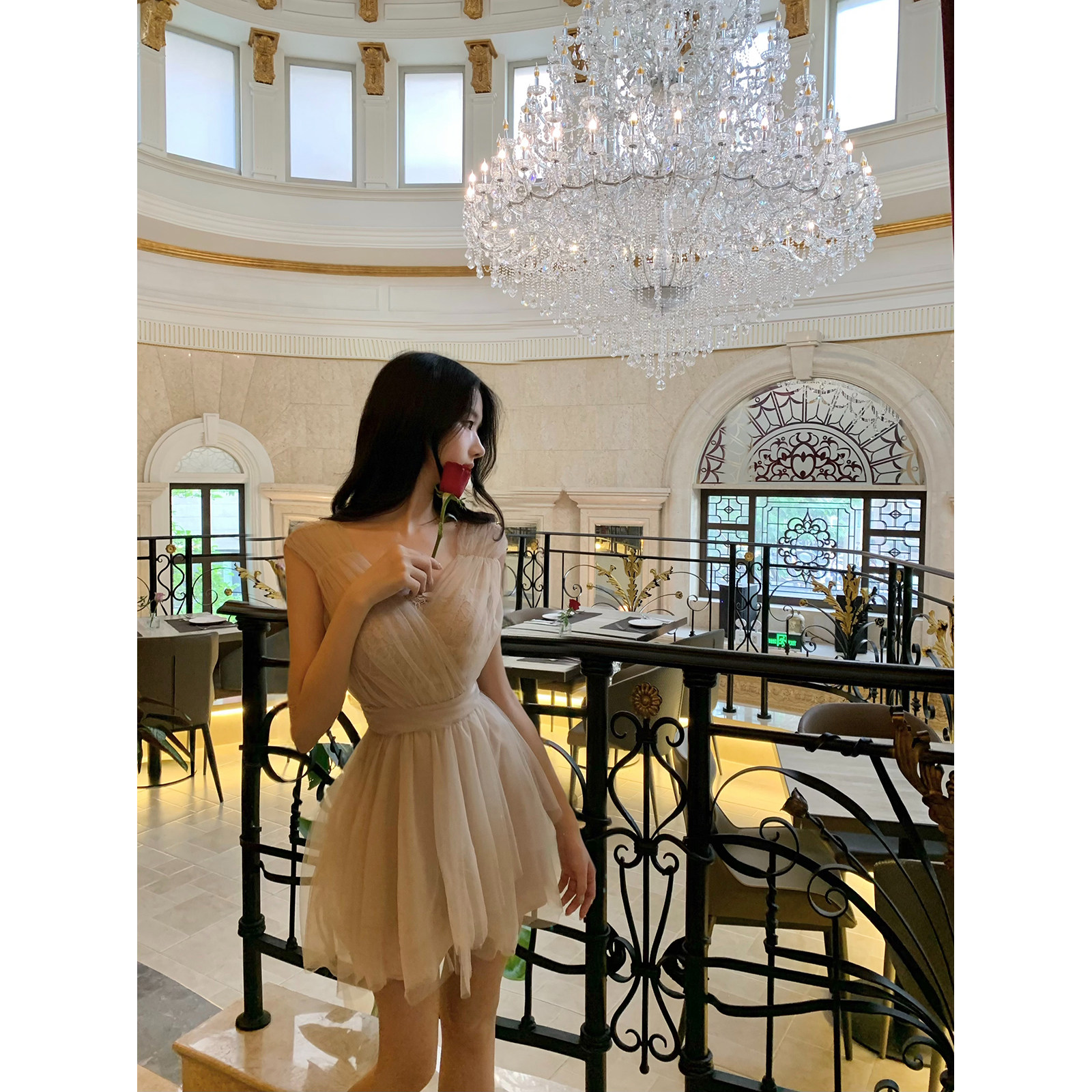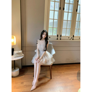 收腰蓬蓬裙 修身 怪诞女孩 miu系风千金感蝴蝶结撞色抹胸连衣裙女
