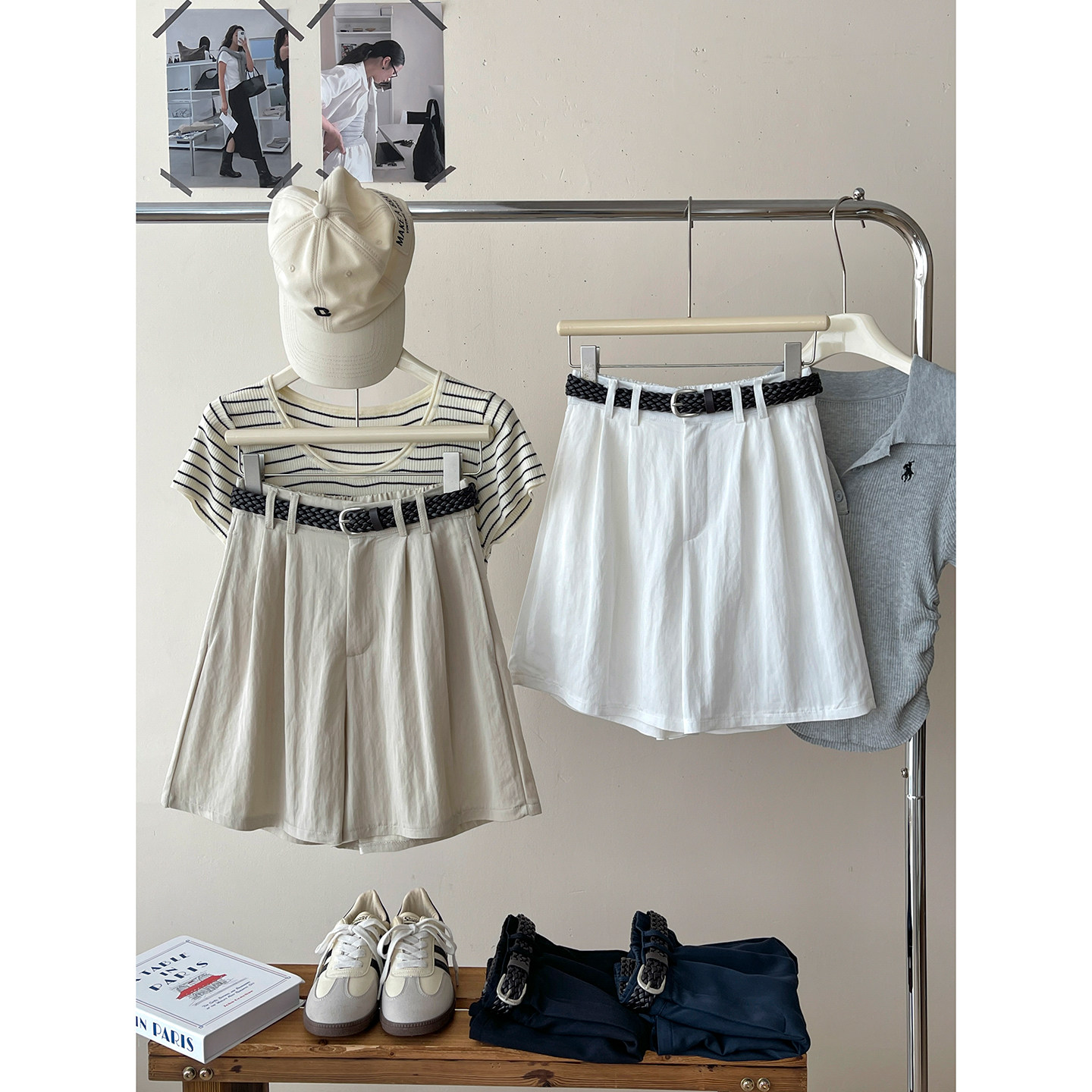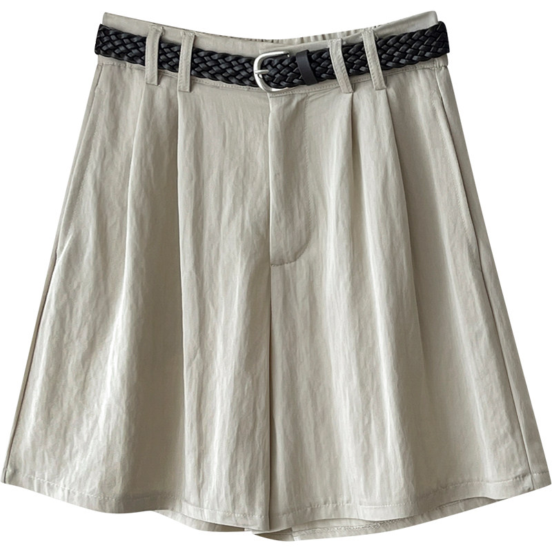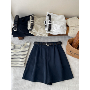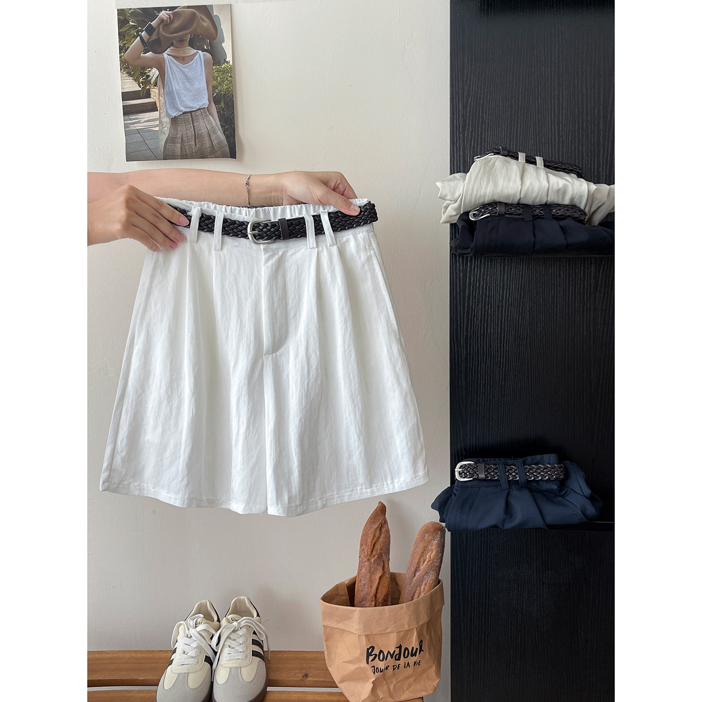 日韩系chic冰天丝亚麻棉五分短裤 子 女夏编织腰带a字百搭休闲中裤