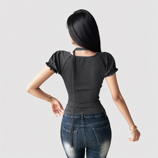 T恤复古黑色方领围脖收腰上衣 少女感白色蕾丝低胸短袖 FUNOFF 法式