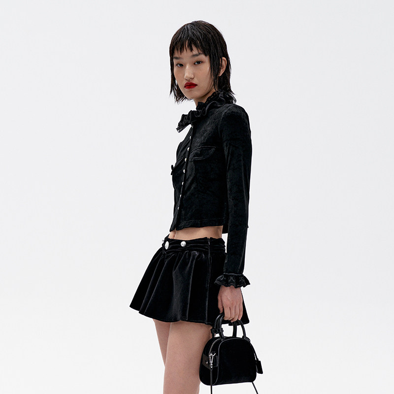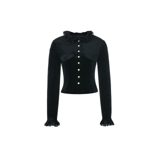 lefame拉飞姆欧根纱荷叶边上衣黑丝绒衬衫 设计感