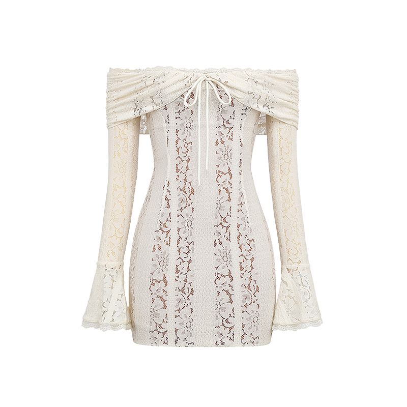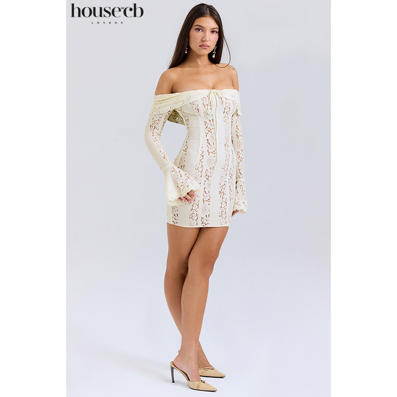 优雅迷人复古奶油色花卉蕾丝一字肩迷你连衣裙Sadie House