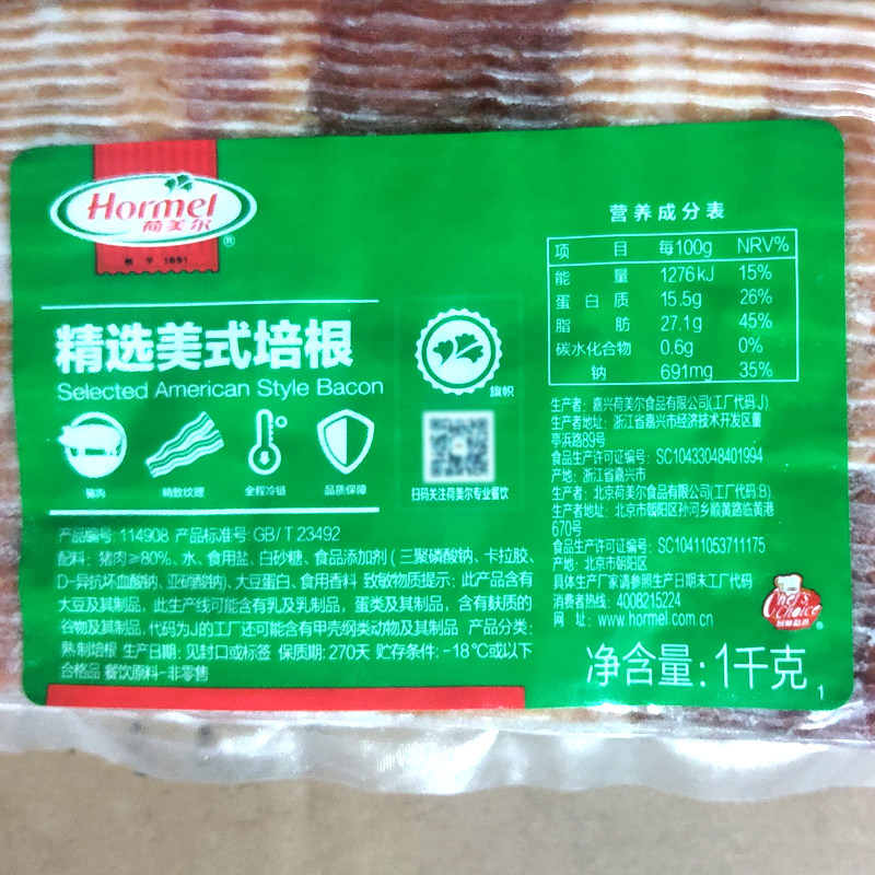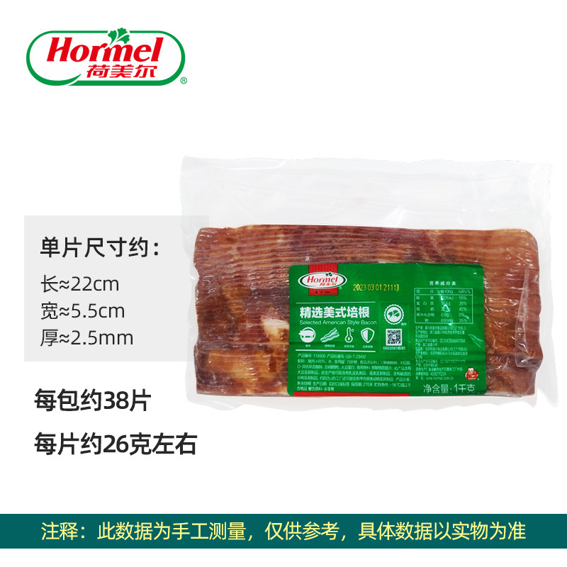 荷美尔精选美式 10包三明治专用烟熏培根猪肉片商用整箱 培根1kg