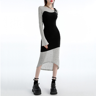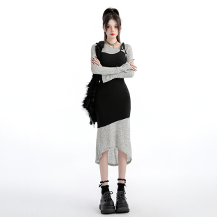 原创假两件中长针织连衣裙包臀裙女黑色修身 不规则辣妹高级感长裙