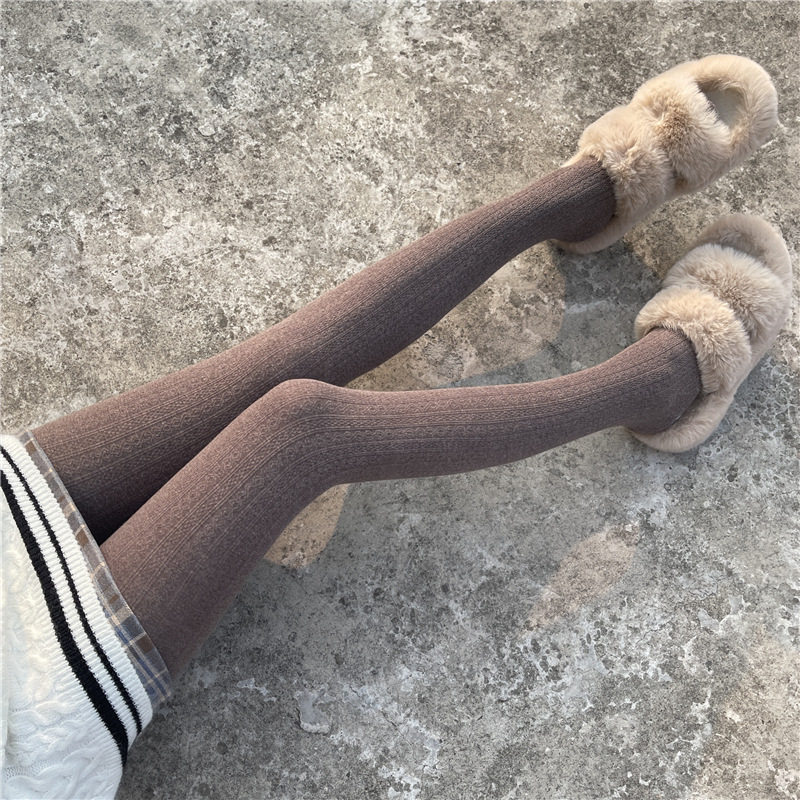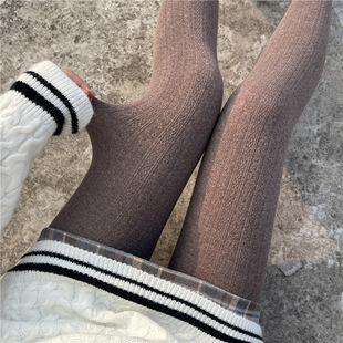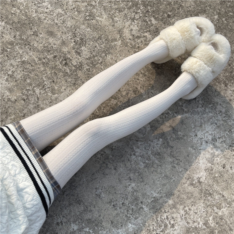 加绒加厚保暖踩脚 袜女秋冬季 加大加肥白色打底裤 日系针织麻花连裤