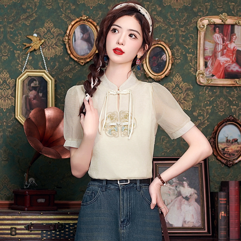 衬衫 2024新中式 宽松百搭洋气短袖 女夏新款 上衣 国风盘扣刺绣雪纺衫