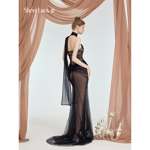 新款 Sheer 鱼骨拖尾长裙夏季 Uma 网纱褶皱显瘦抹胸连衣裙 Luck