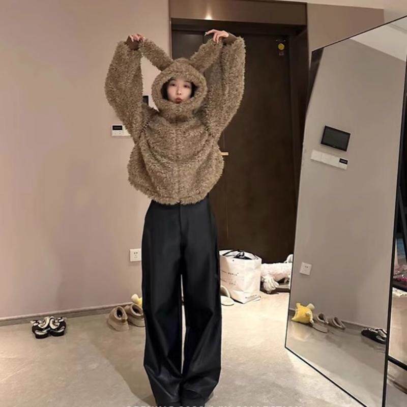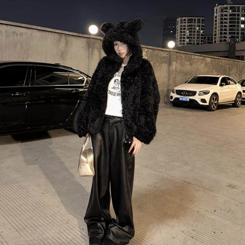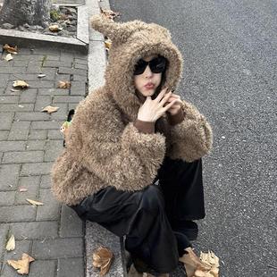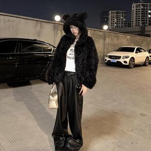 2025冬季 白色羊羔毛连帽皮草外套女加厚皮毛一体毛毛外套大衣 新款