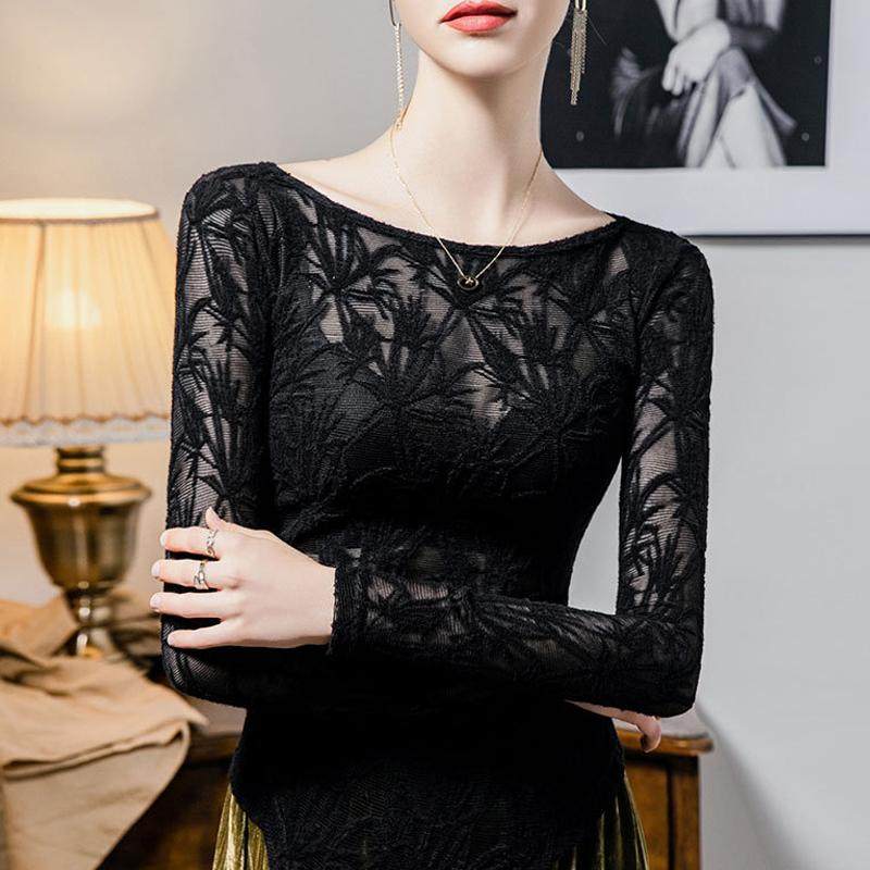 长袖 女修身 t恤 雷丝打底衫 气质一字领蕾丝上衣高级感勾花镂空薄款