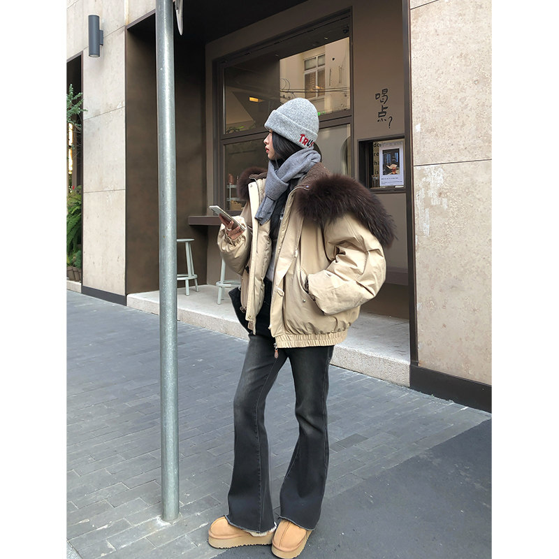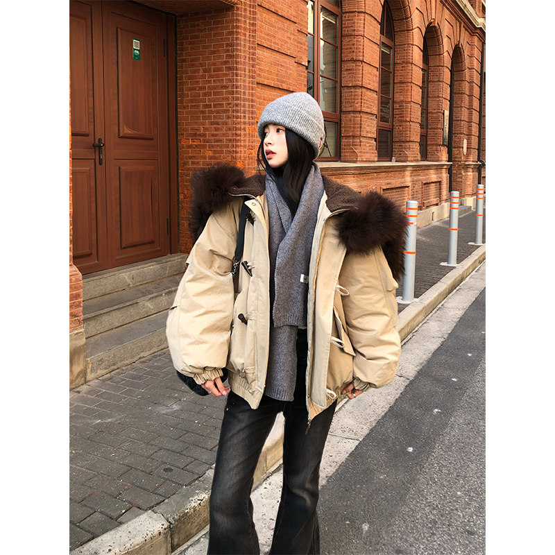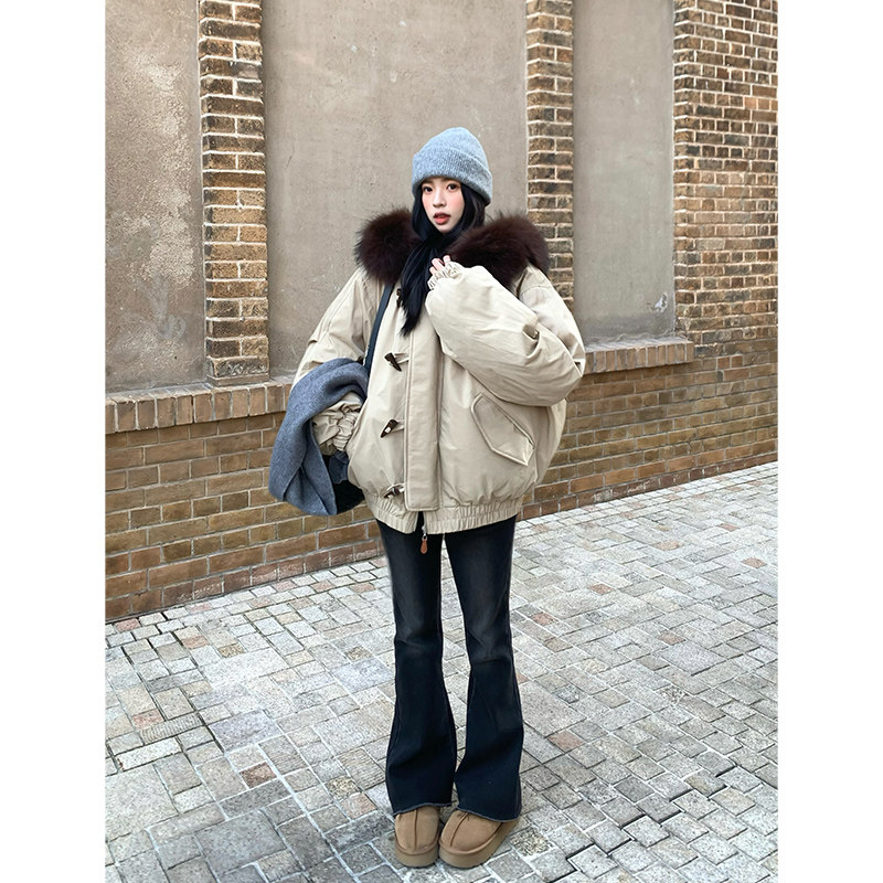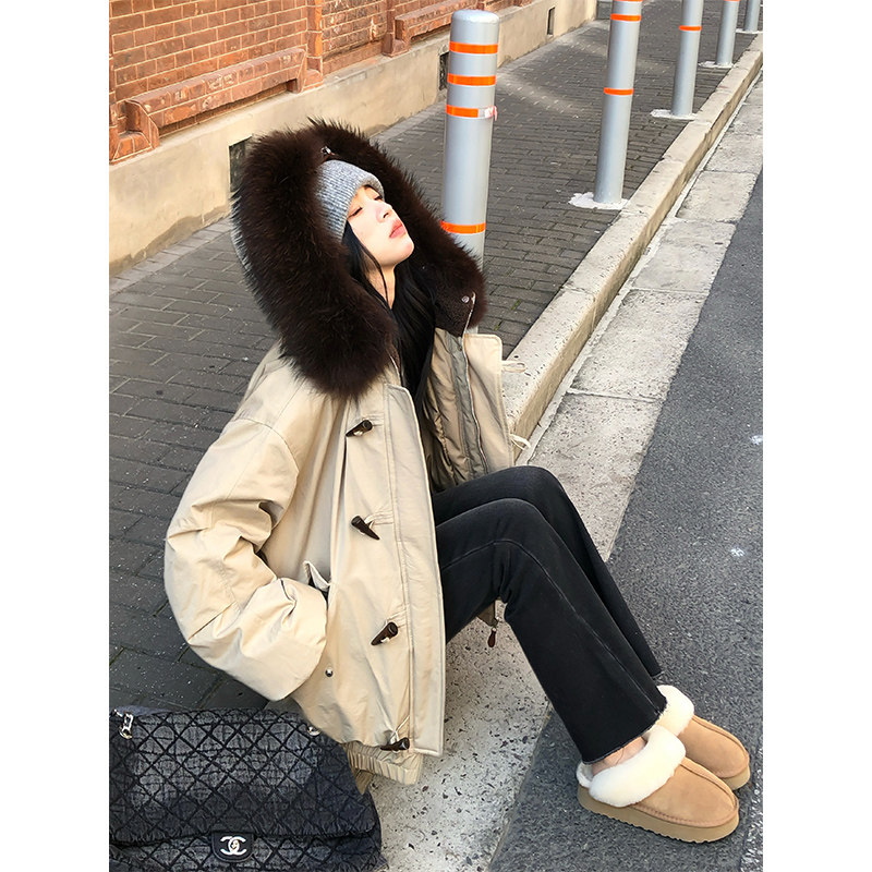 Adan派克毛领羽绒服90白鸭绒宽松休闲慵懒牛角扣狐狸毛领外套冬女