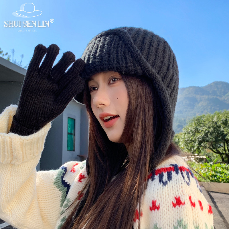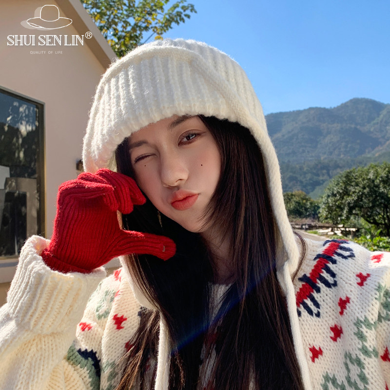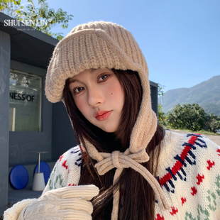 可爱小熊耳朵毛线帽子女2025秋冬季 防寒保暖毛绒绒护耳针织帽 新款