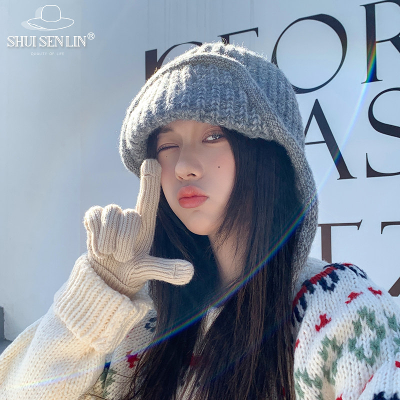 2025秋冬抽绳针织堆堆帽女百搭日系大头围显瘦包头冷帽网红毛线帽