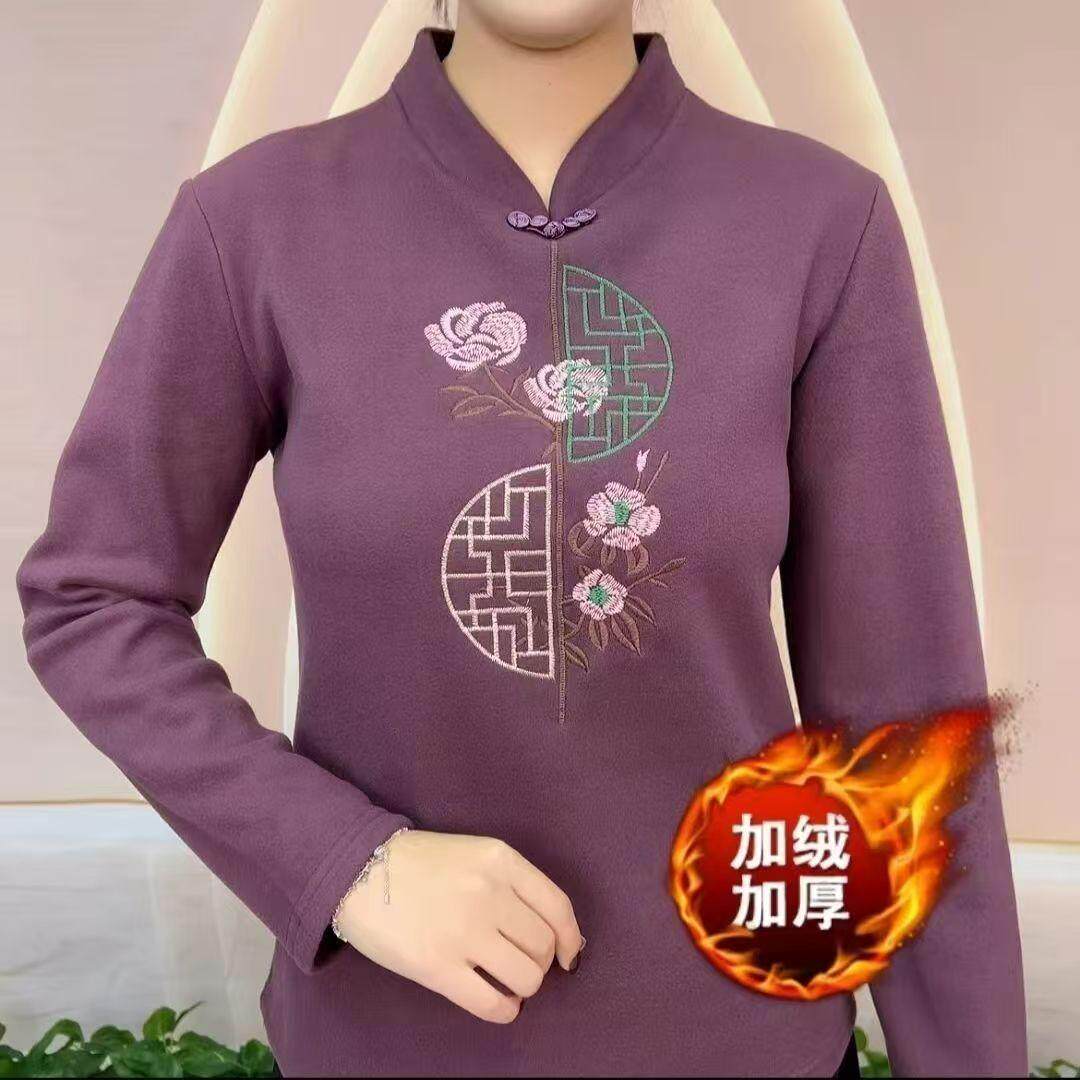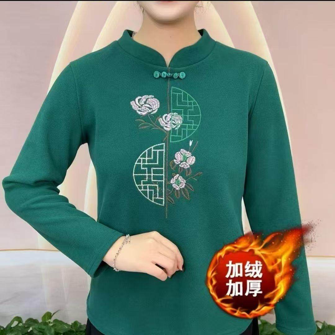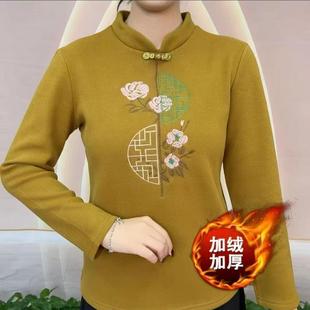 加绒加厚保暖打底女装 秋冬中老年妈妈上衣高贵民族刺绣花T恤卫衣