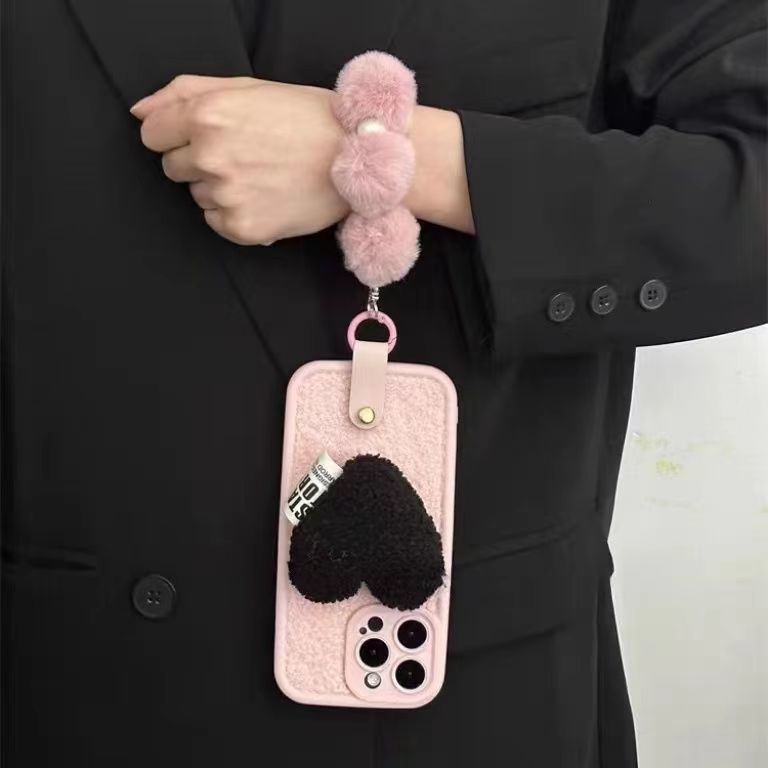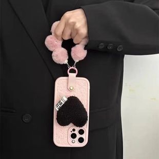 秋冬毛绒经典 粉黑撞色毛绒爱心适用16苹果15promax手机壳iphone13氛围感11小众12软7p8手拎绳14pro保护套
