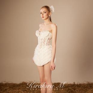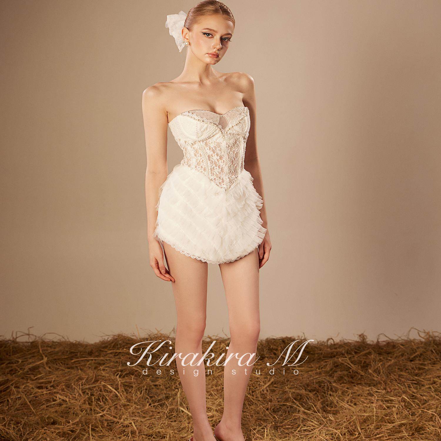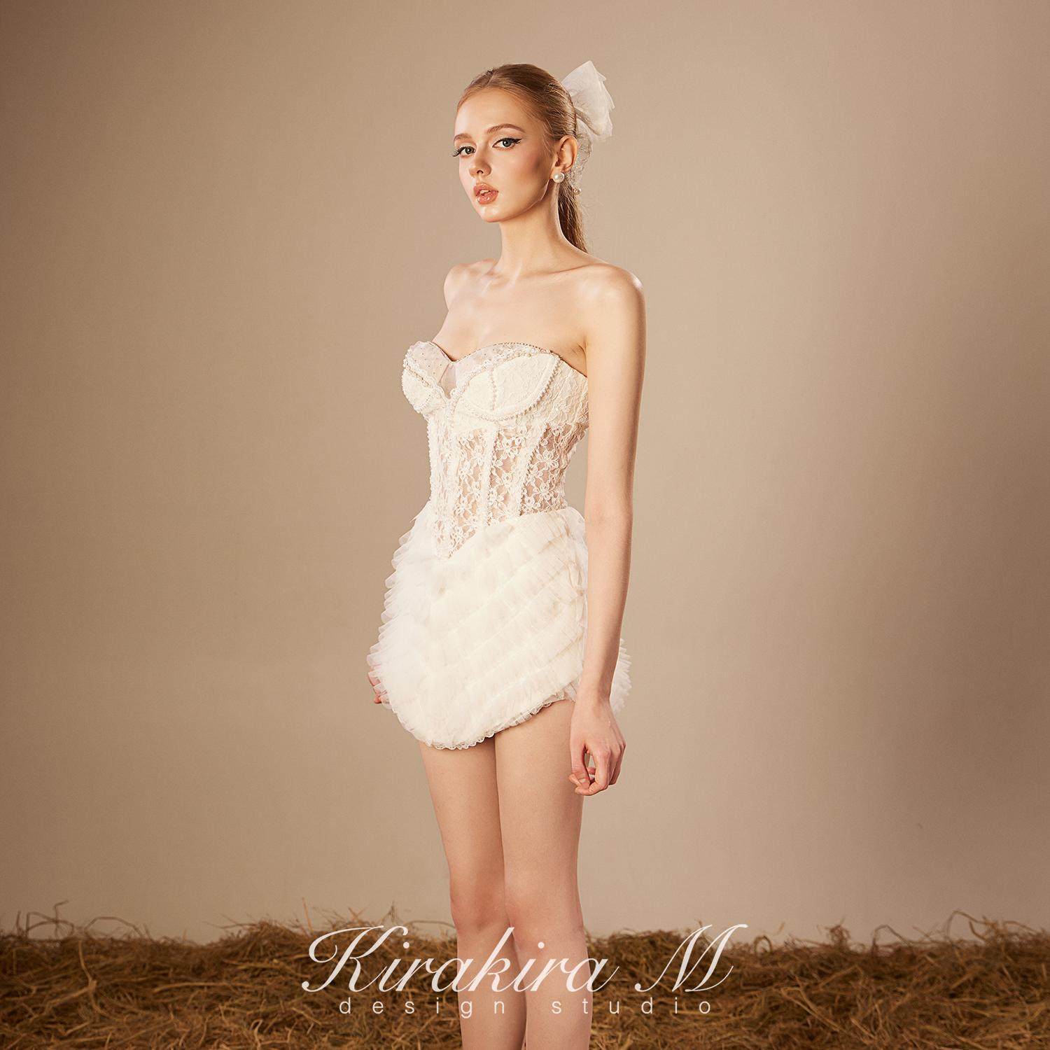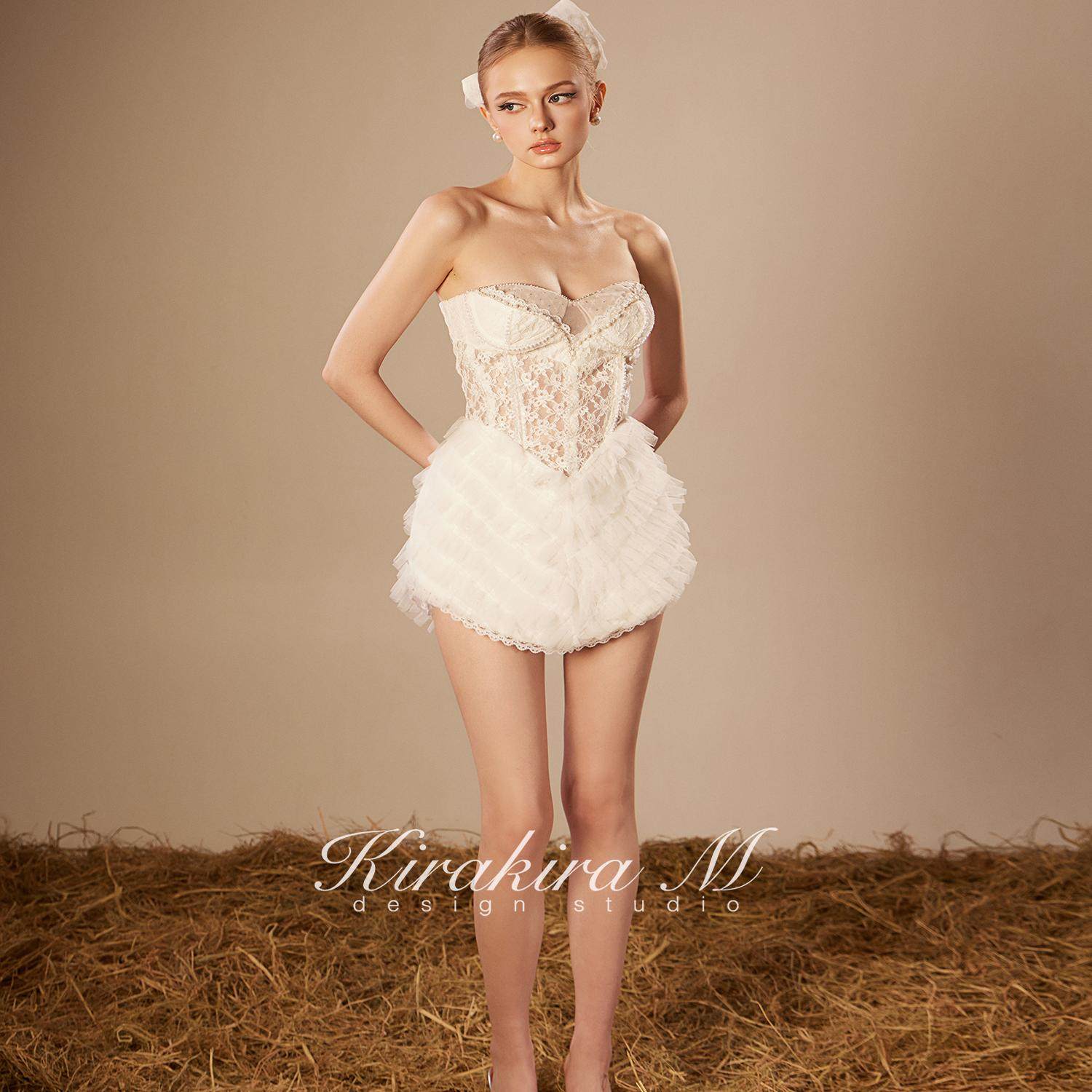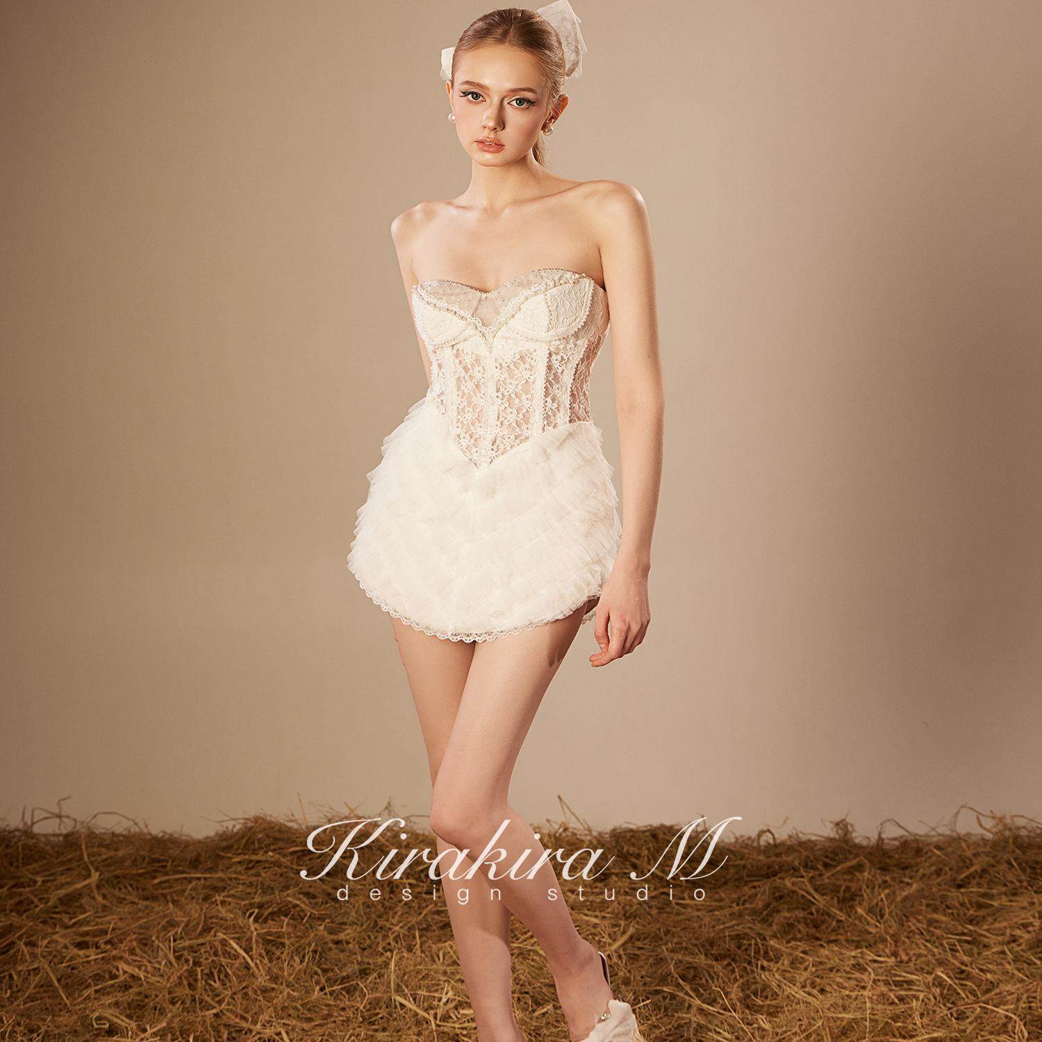 KirakiraM 白色珠片蕾丝亮钻鱼骨层层蛋糕抹胸裙 Wonderlust