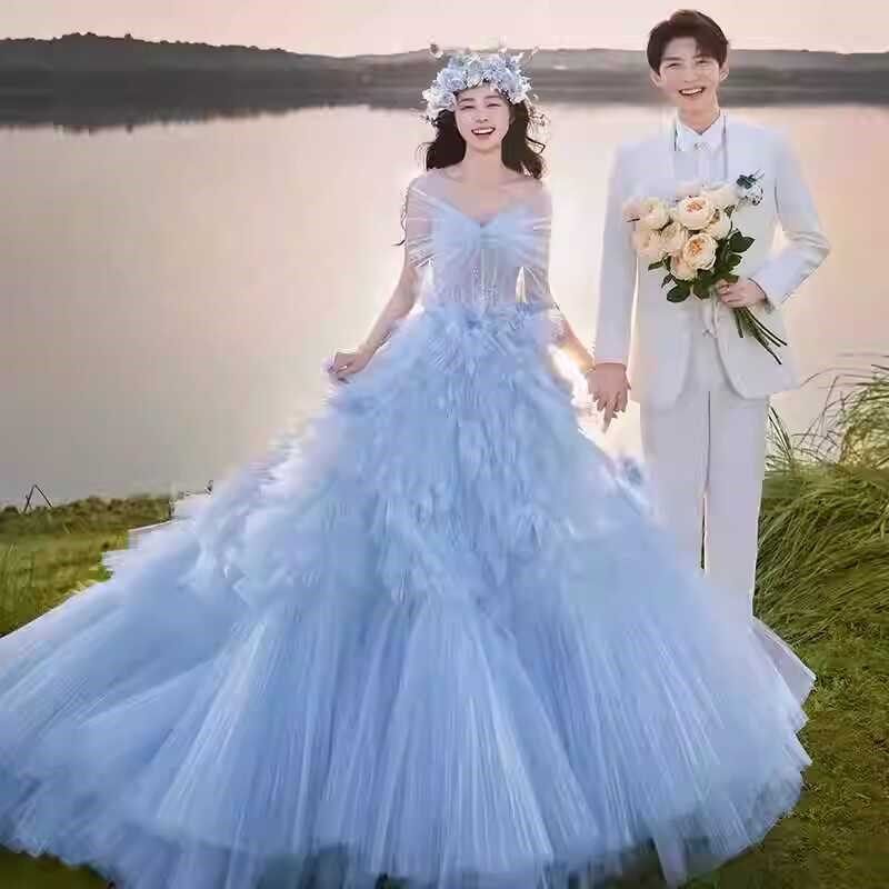 森系网纱情侣外景拍照抹胸拖尾礼服摄影写真黑色婚纱影楼主题服装